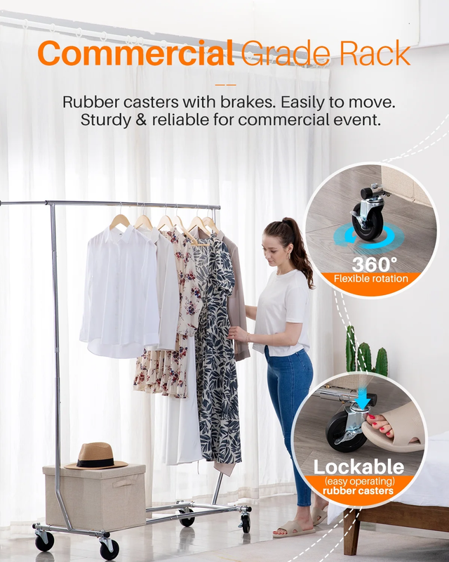 ?Convenient to Move?- This clothing rack has four removable rolling solid rubber casters (2 with locking brake), which enable the garment racks to be moved without leaving scuff marks and scratches on flooring. Let you easily move your clothes anywhere while loaded.
