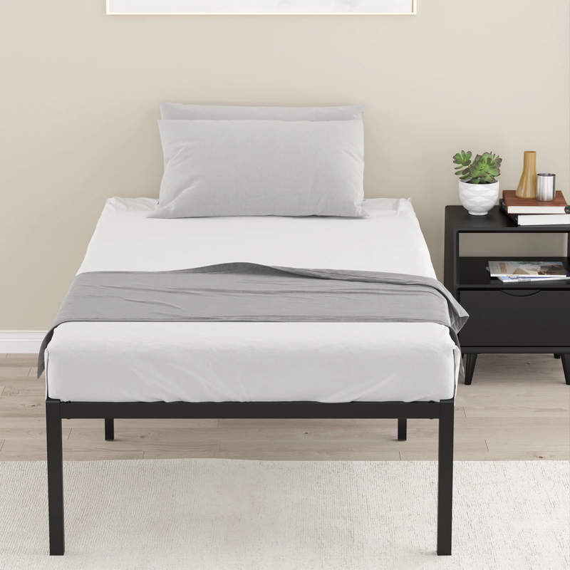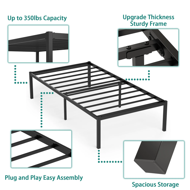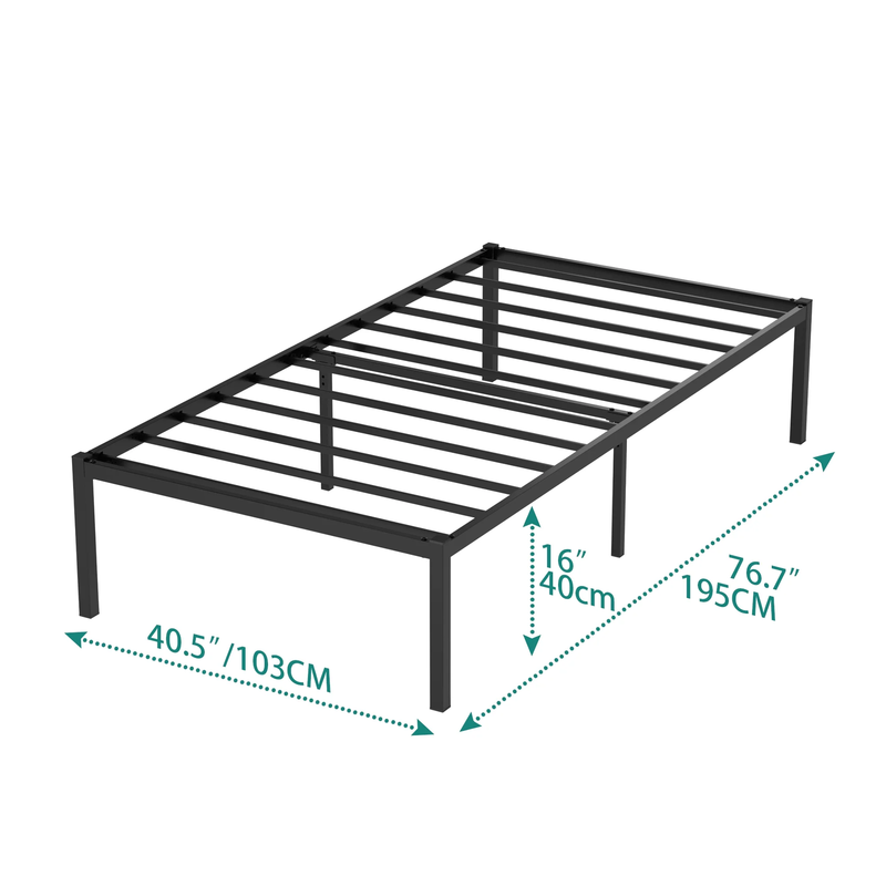 Super Sturdy System: Upgraded strong steel metal structure for enhanced durability, 20% stronger and heavier than similar bed frames Non-Slip Design: Encloses the mattress to prevent slipping, reduces noise, and protects the floor for a better sleep experience Large Storage Space: 16-inch tall design provides ample under-bed storage for personal items, maximizing your space Ultimate Strength and Durability: Sturdy steel slats support heavier deluxe mattresses without the worry of slats breaking down Easy Assembly : Designed for minimal assembly, making setup quick and hassle-free Specifications Material: Steel Twin Size Product/Package Dimension: 76.7" x 40.5" x 15.7" / 43.7" x 8.19" x 3.35" (LxWxH) Full Size Product/Package Dimension: 76.7" x 54.7" x 15.7" / 60.01" x 7.48" x 3.35" (LxWxH) Queen Size Product/Package Dimension: 82.2" x 61.4" x 15.7" / 65.75" x 7.48" x 3.35" (LxWxH) King Size Product/Package Dimension: 82.2" x 77.5" x 15.7" / 81.89" x 7.48" x 3.35" (LxWxH) Package Weight: Twin 26.46 lbs; Full 37.48 lbs; Queen 41.89 lbs; King 46.3 lbs Capacity: 350 lbs No box spring needed Headboard compatible (not included) Package Includes 1 x Twin Metal Bed Frame 1 x Instruction for Installation 1 x Poly Bag 1 x Screw Set