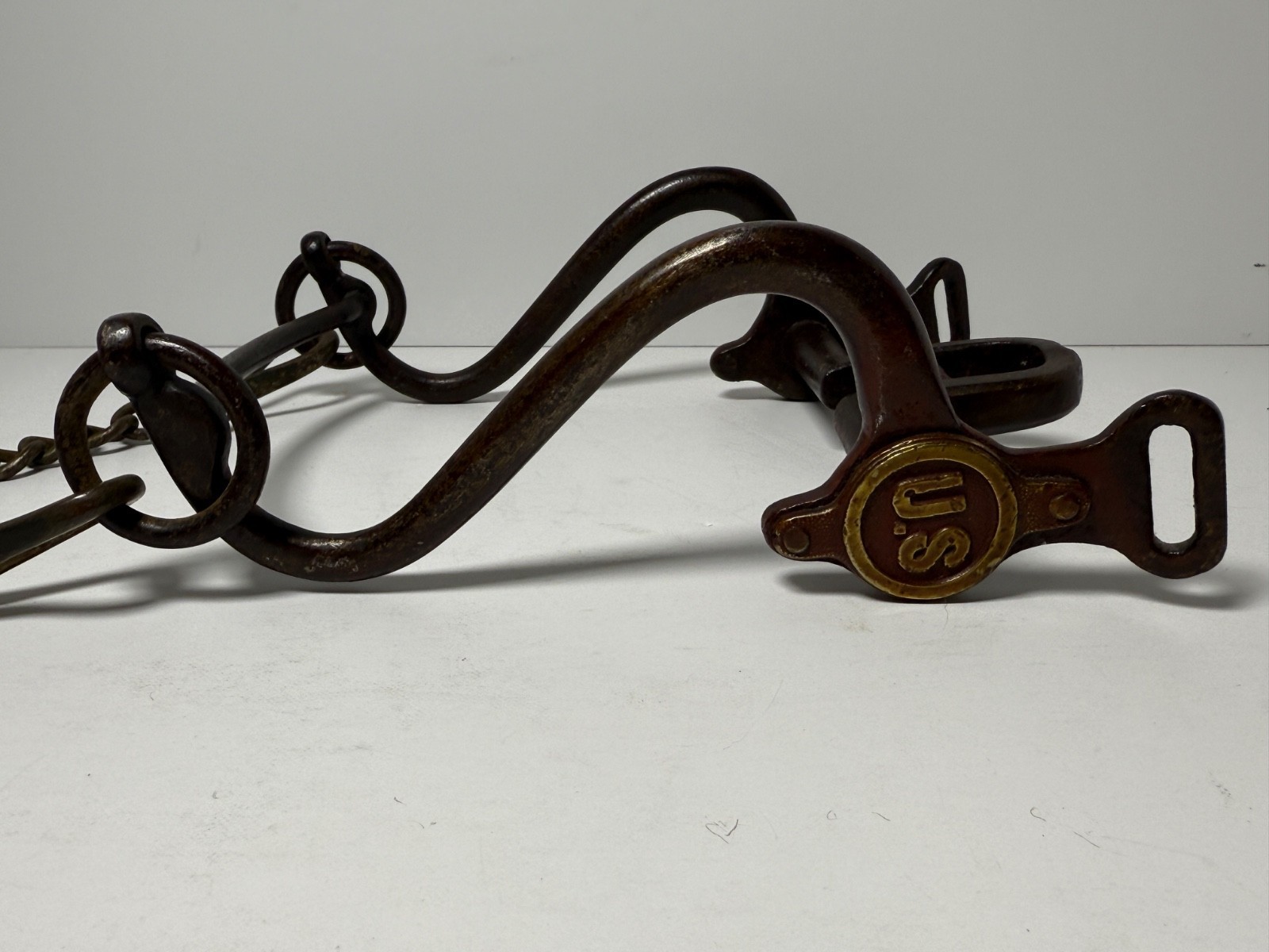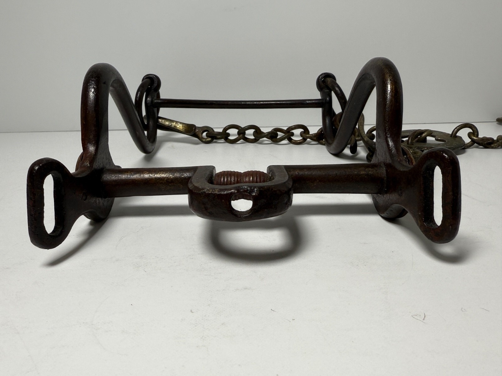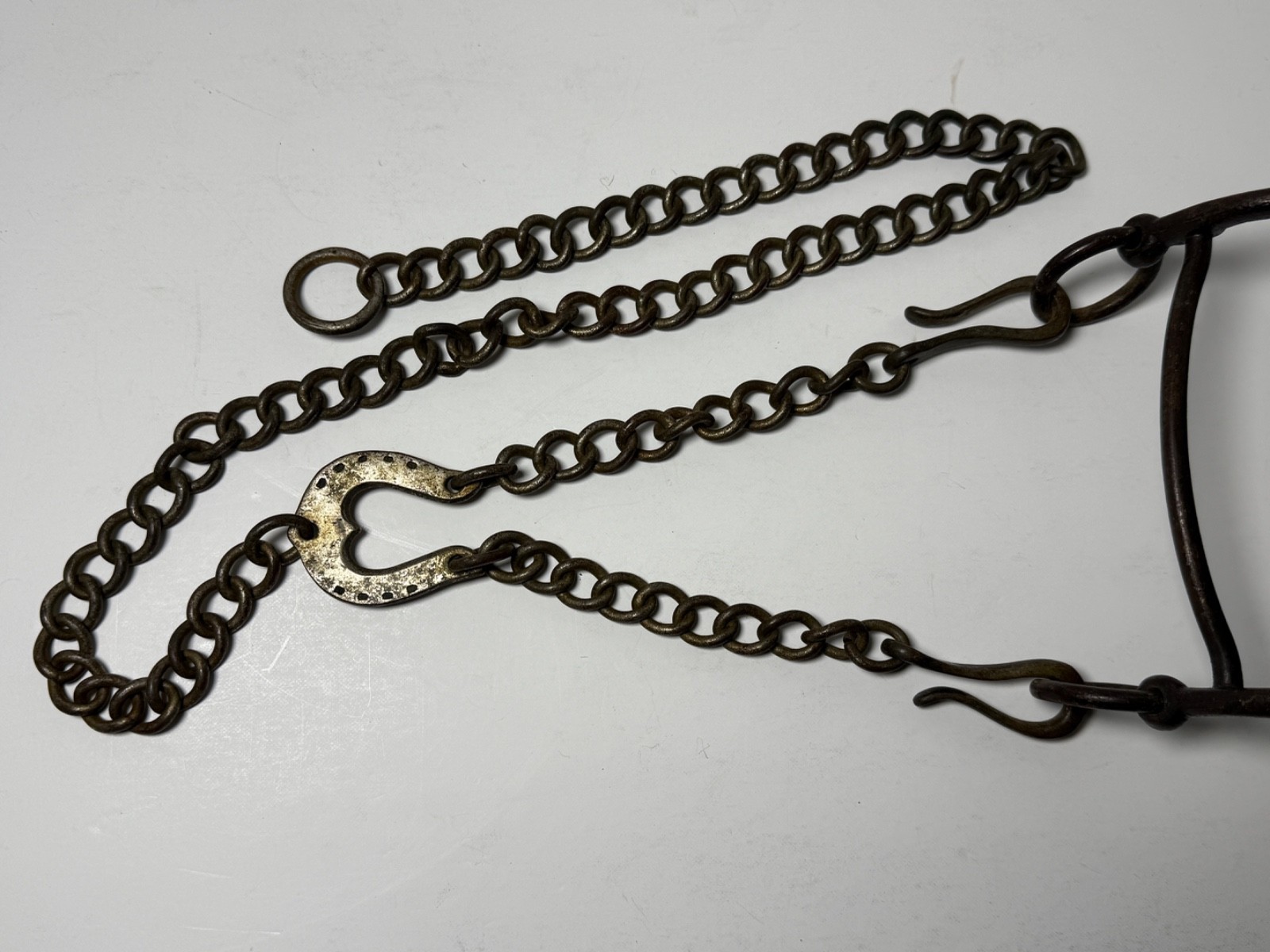 The side bosses and the ?cricket? or ?roller?, the ribbed cylinder in the mouthpiece port is made of brass and are intact. Take note of the side bosses, they each have a period after the letter ?U? Earlier models did not have any periods. The ?cricket? or ?roller? acted as a pacifier, providing the horse with a distraction to occupy itself, as well as stimulating the horse to salivate and keep the bit lubricated. Unmarked, unknown maker. The hole that you can see centered on the mouthpiece port supported the ring which would have been riveted to this mouthpiece. In this case the ring was removed. These rings had the effect of causing the horse to become frenzied under a rough hand and were inhumane to use. A steel chain with two open hooks is attached to the two rings. The two chains are then connected to a steel horseshoe. A 27? chain is connected to the top of the horseshoe.