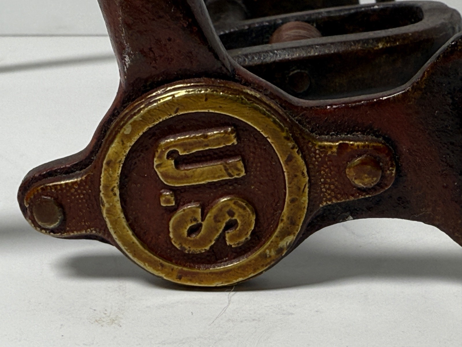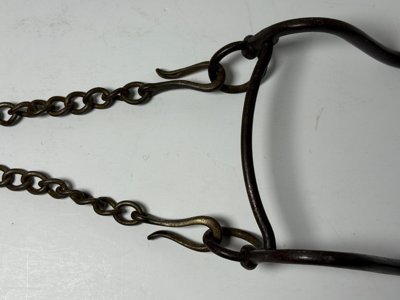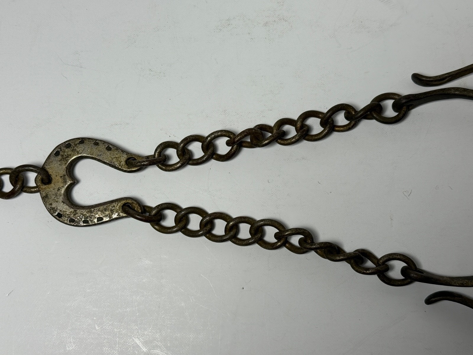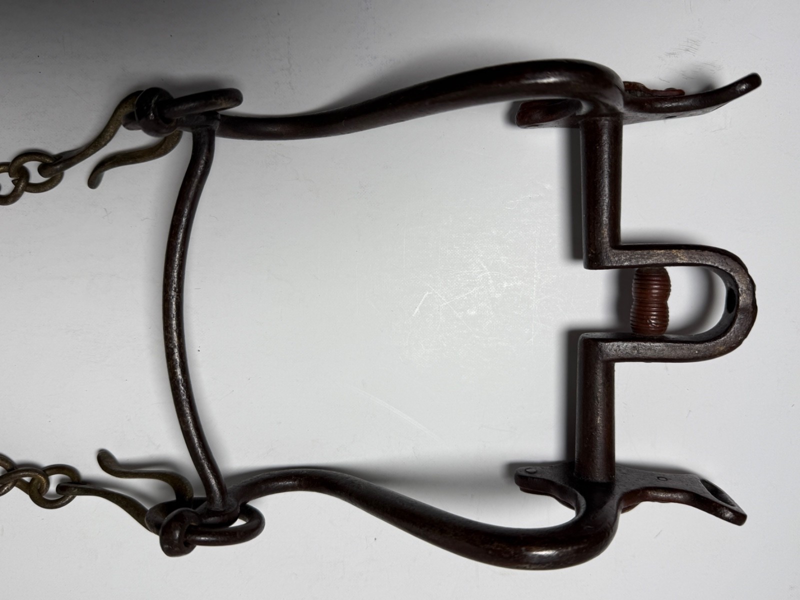 The side bosses and the ?cricket? or ?roller?, the ribbed cylinder in the mouthpiece port is made of brass and are intact. Take note of the side bosses, they each have a period after the letter ?U? Earlier models did not have any periods. The ?cricket? or ?roller? acted as a pacifier, providing the horse with a distraction to occupy itself, as well as stimulating the horse to salivate and keep the bit lubricated. Unmarked, unknown maker. The hole that you can see centered on the mouthpiece port supported the ring which would have been riveted to this mouthpiece. In this case the ring was removed. These rings had the effect of causing the horse to become frenzied under a rough hand and were inhumane to use. A steel chain with two open hooks is attached to the two rings. The two chains are then connected to a steel horseshoe. A 27? chain is connected to the top of the horseshoe.