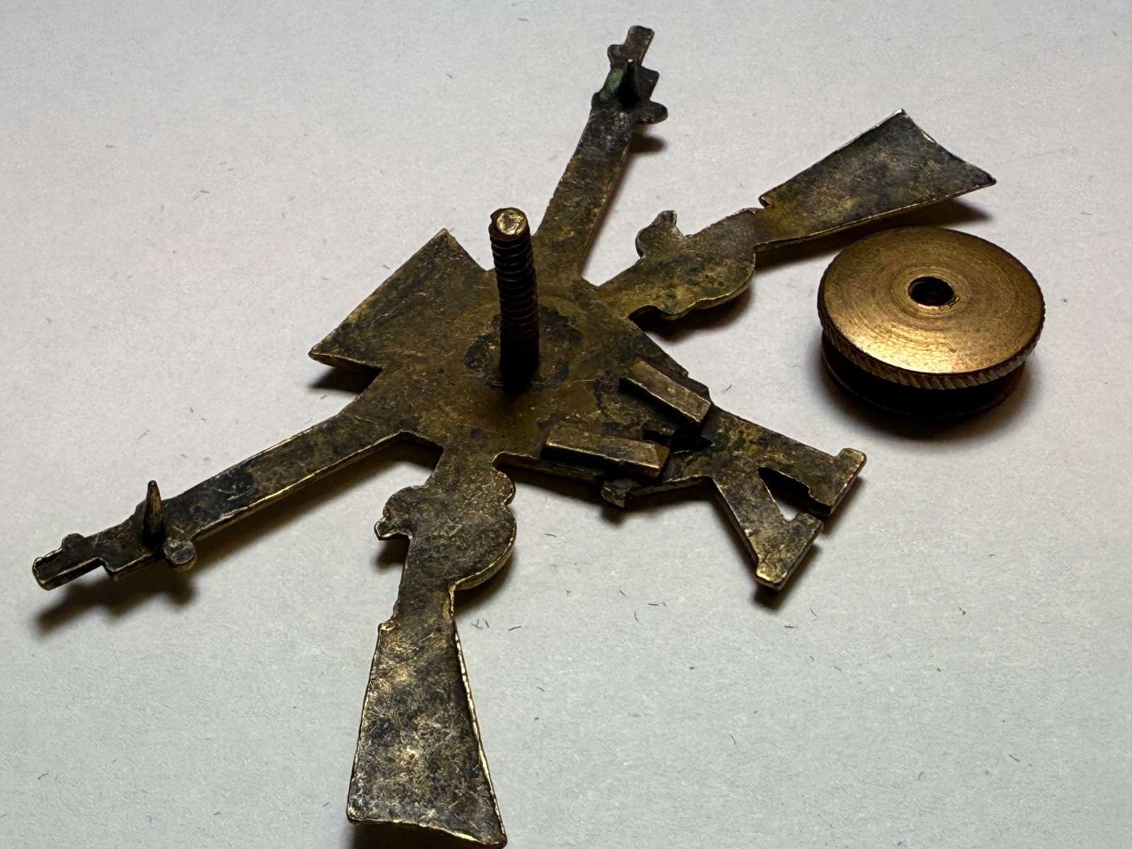 With blue colored enameled keystone symbol in center with Company letter below. Screw style attaching disc on reverse. Blue?3d Brigade, south and north central part of state.