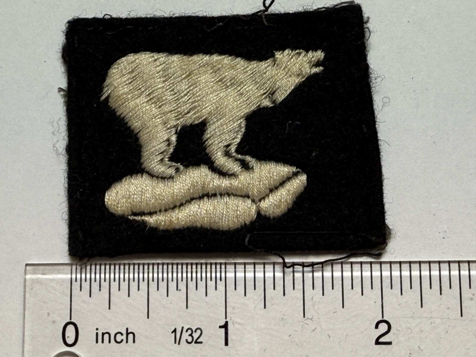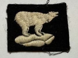This is the third version of the Polar Bear patches. Cotton embroidery on black wool base. Displays honest age and does not react to ultra violet light, nice original Polar Bear Patch. This was removed from a uniform.