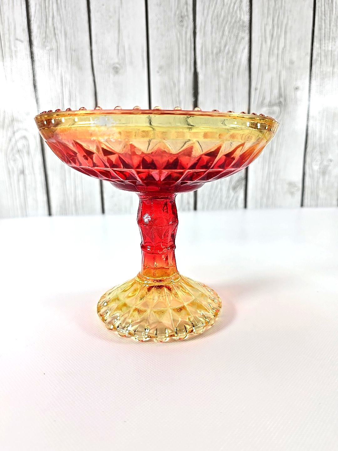This vibrant Amberina glass compote showcases a radiant red to gold fade with an elegant pedestal base. Its footed form gleams as a dazzling candy dish or striking vintage accent on bar cart mantel or dining table.