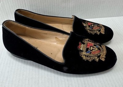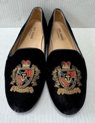 Jon Josef Black Velvet Gatsby Shield Emblem Leather Loafers Flats Shoes Size 7.5