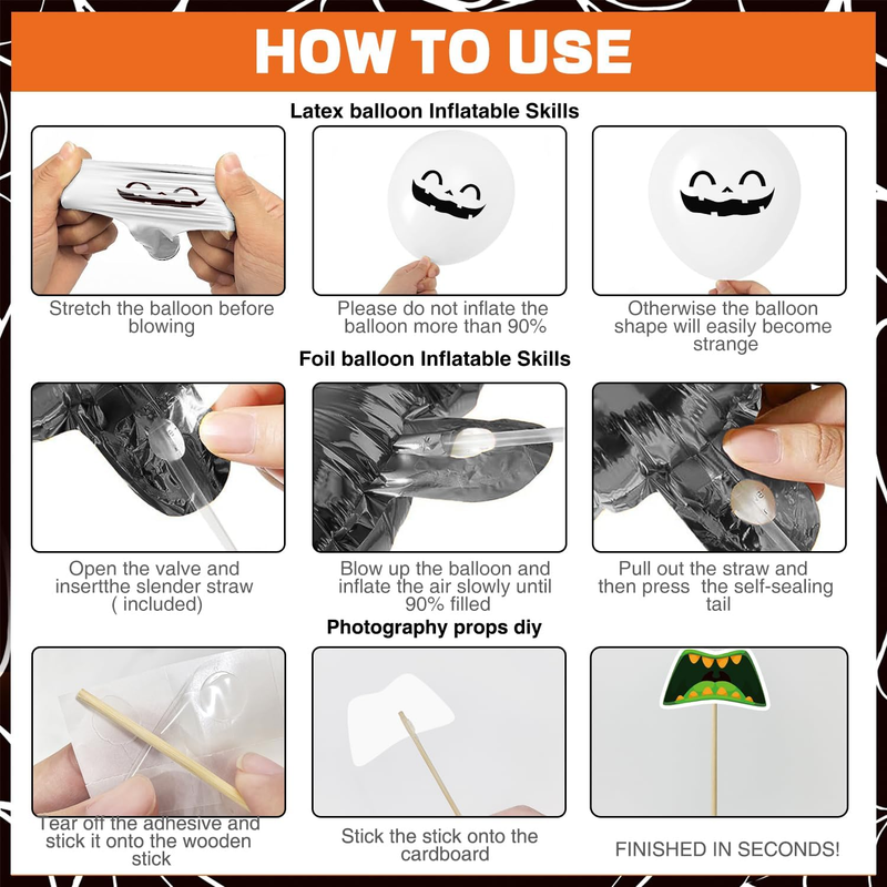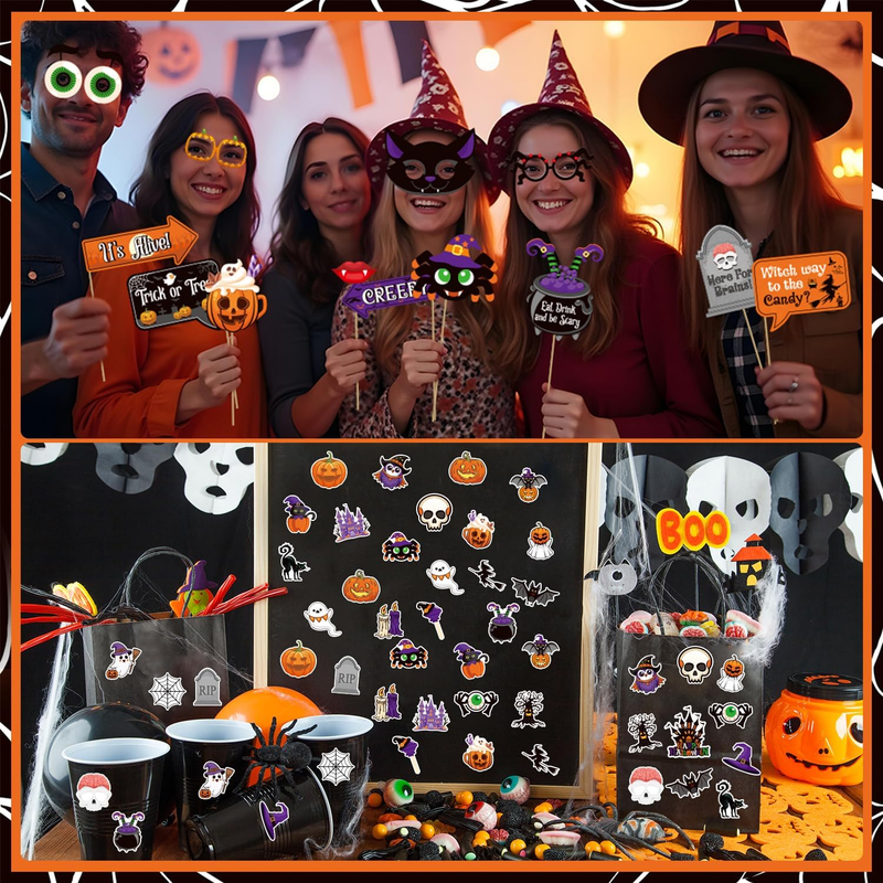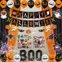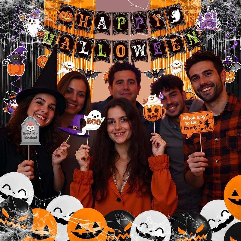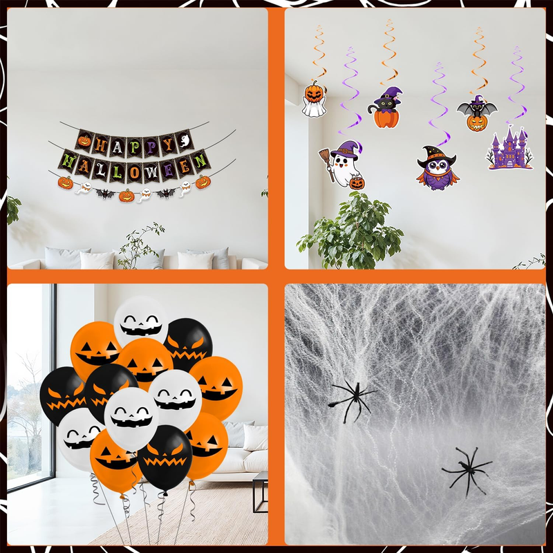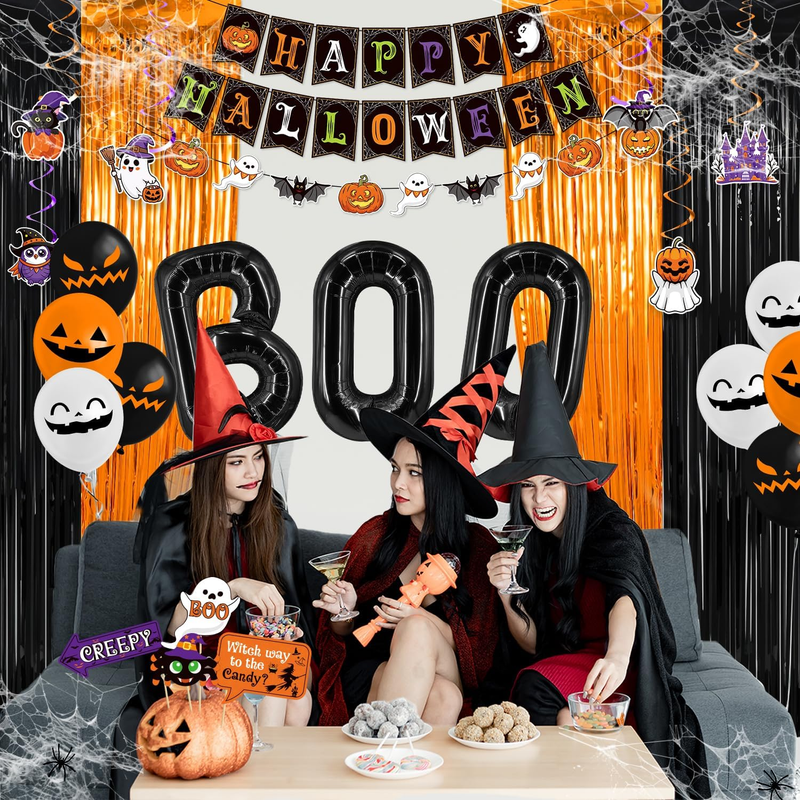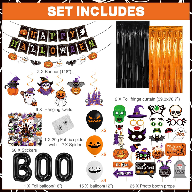 Happy Halloween: our Halloween decorations indoor contain 2 fringe curtains in black and orange, 1 No-DIY happy Halloween banner, 1 pumpkin ghost beat garland, 25 pcs Halloween photo booth props, 50 Halloween stickers(25 designs, each one has 2 pieces), 6 paper cutouts, 6 Halloween foil hanging swirls, BOO letter foil balloons, 15 latex balloons in 3 colors(black, orange, white), 20g spider wed, 2 spider, 1 straw and 1coil. Our Halloween Decorations Party needs almost festival needs.