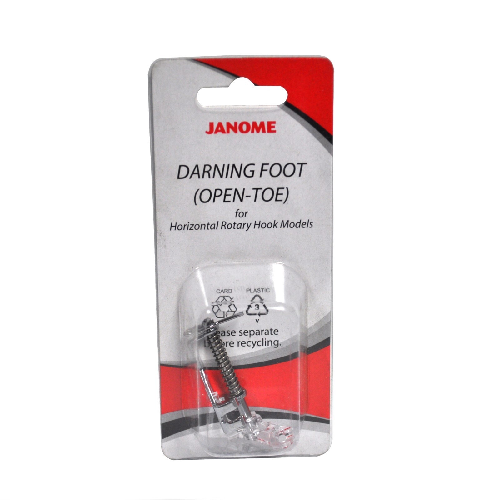 Janome Darning Foot Open-Toe 200340001. For horizontal Rotary Hook Models. Sometimes referred to as the embroidery foot, the Janome Darning Foot Open Toe is used for 'free hand' embroidery and darning to ensure proper stitch formation, minimize skipped stitches and puckering and also protect your fingers while you move your fabric freely under the needle. Especially beneficial to those just learning how to do free hand embroidery. The Janome Darning Foot Open Toe version greatly improves visibility of stitches and is especially popular with quilters. The Janome Darning Foot Open Toe is one of the best because visibility is the greatest at the needle. Manufacturer Part Number: 200340001. JN-200340001