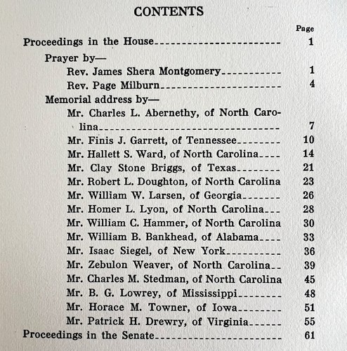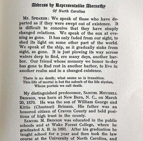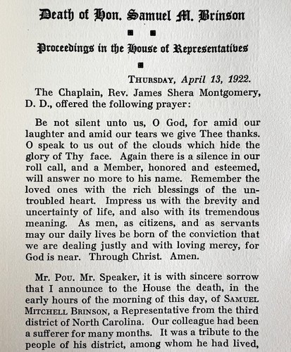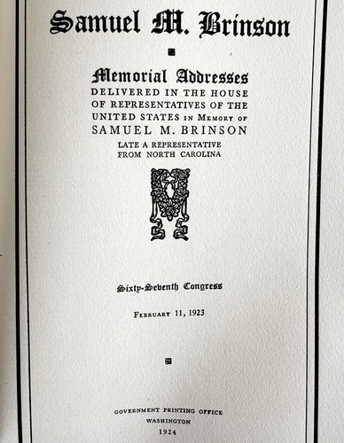 Samuel Brinson Memorial Addresses 1924 67th Congress 1st Edition NC Rep HC E54