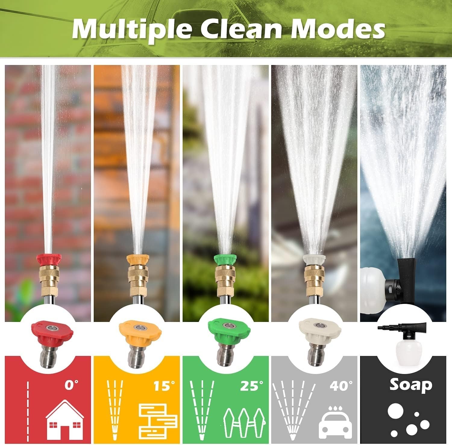 5 QUICK-CONNECT SPRAY TIPS - Power washer comes with 5 interchangeable nozzles (0, 15, 25, 40and soap) to meet your many different cleaning situations. 0º - areas that are high and hard to reach; clean crevices in sidewalks or driveways; 15º- use on concrete, brick and other hard surfaces with stubborn stains; 25º- use on painted surfaces, wood siding, fences and lawn mowers;40º- use on windows and screens;soap- use to spray soaps and detergents.