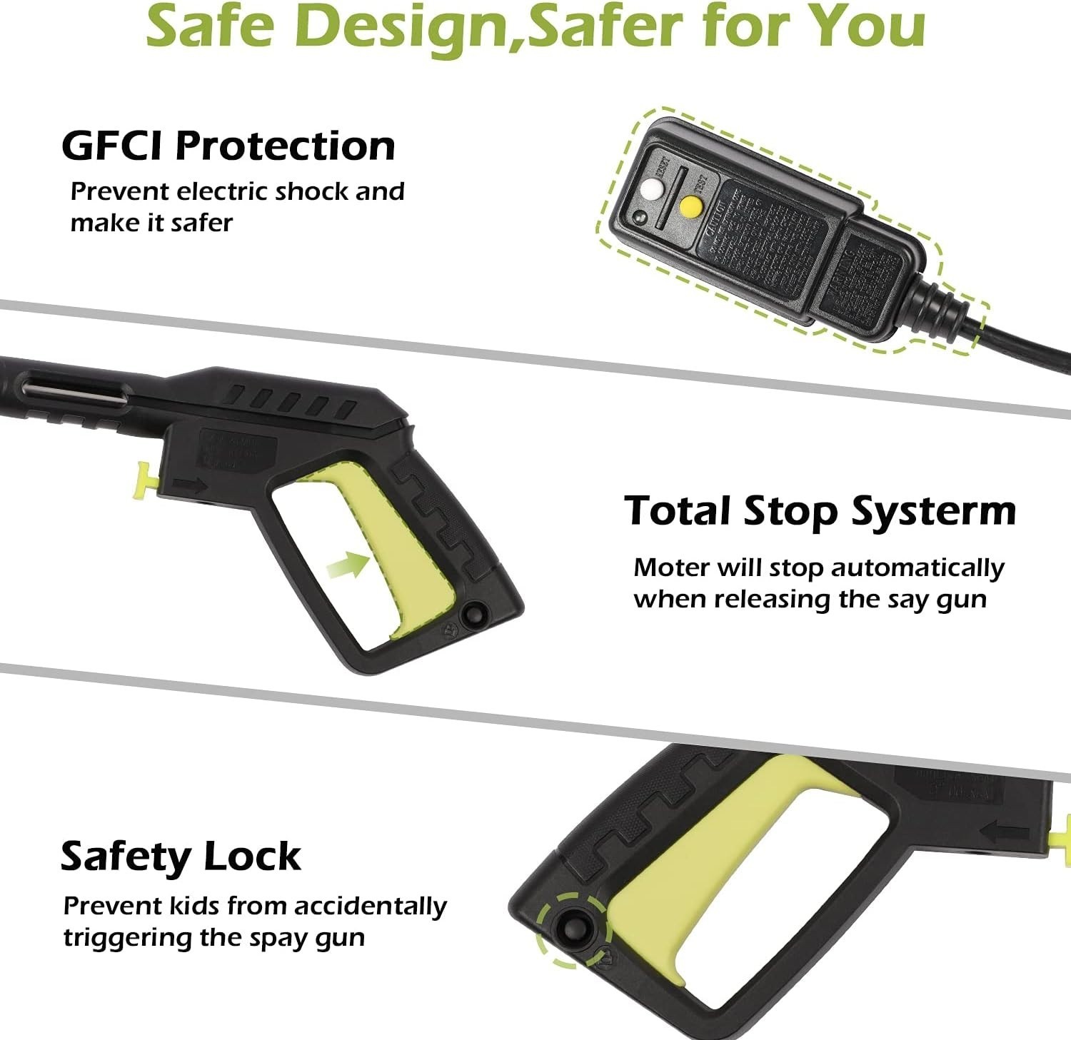 SAFE DURABLE - This pressure washer is IPX5 waterproof and features a GFCI plug to prevent electric leakage, allowing you to safely operate this machine without any safety concerns. Our electric washer machines equipped with the safe automatic total stop system (TSS). When the trigger is not used, it will automatically shut down the pump to save energy and extend the life of the pump.