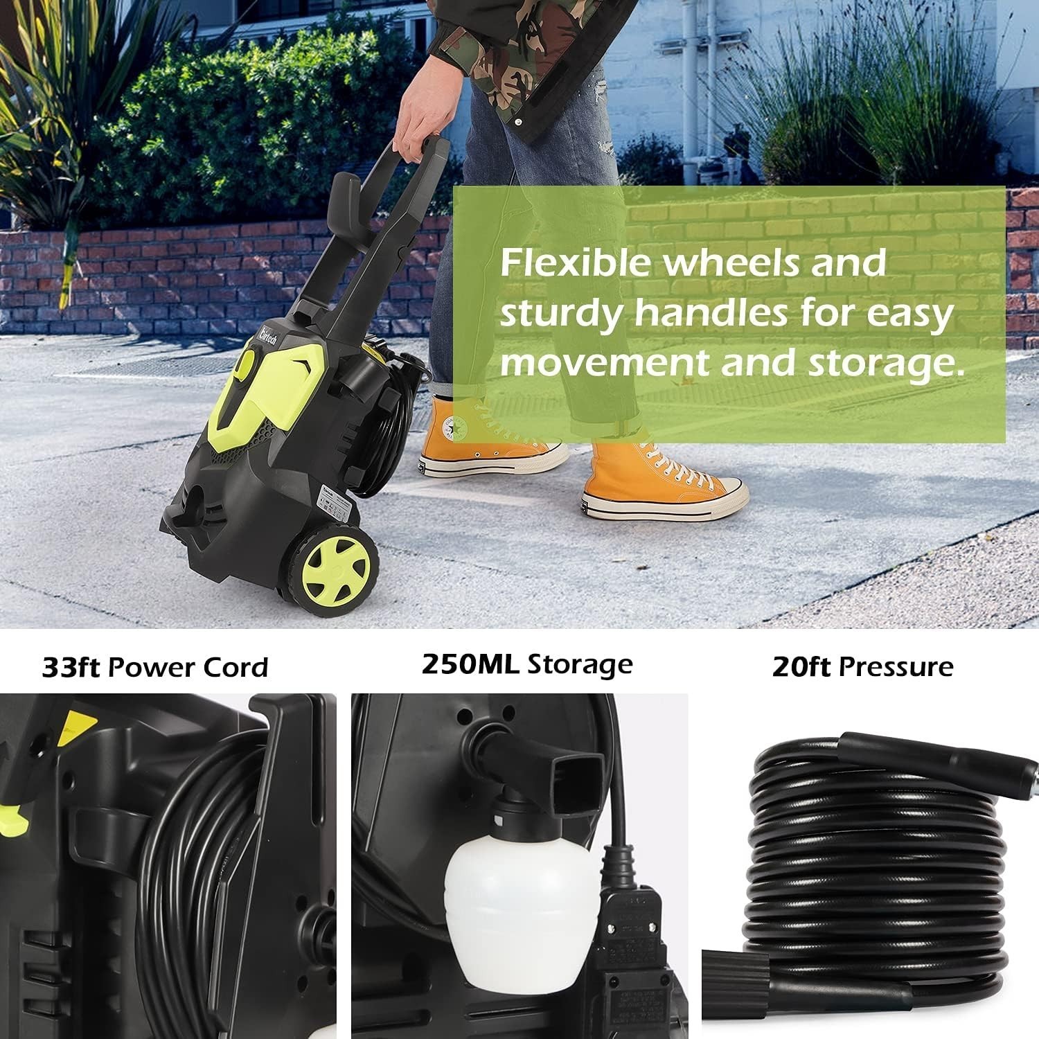 PAY ATTENTION TO DETAILS: A 20-foot high-pressure hose and a 35-foot power cord allow for flexible use in large areas. Wheeled upright trolley makes moving the pressure washer easily and quickly. The spray gun has a safety lock which is safer and more reliable. The unique plug-in spray gun makes it more convenient.