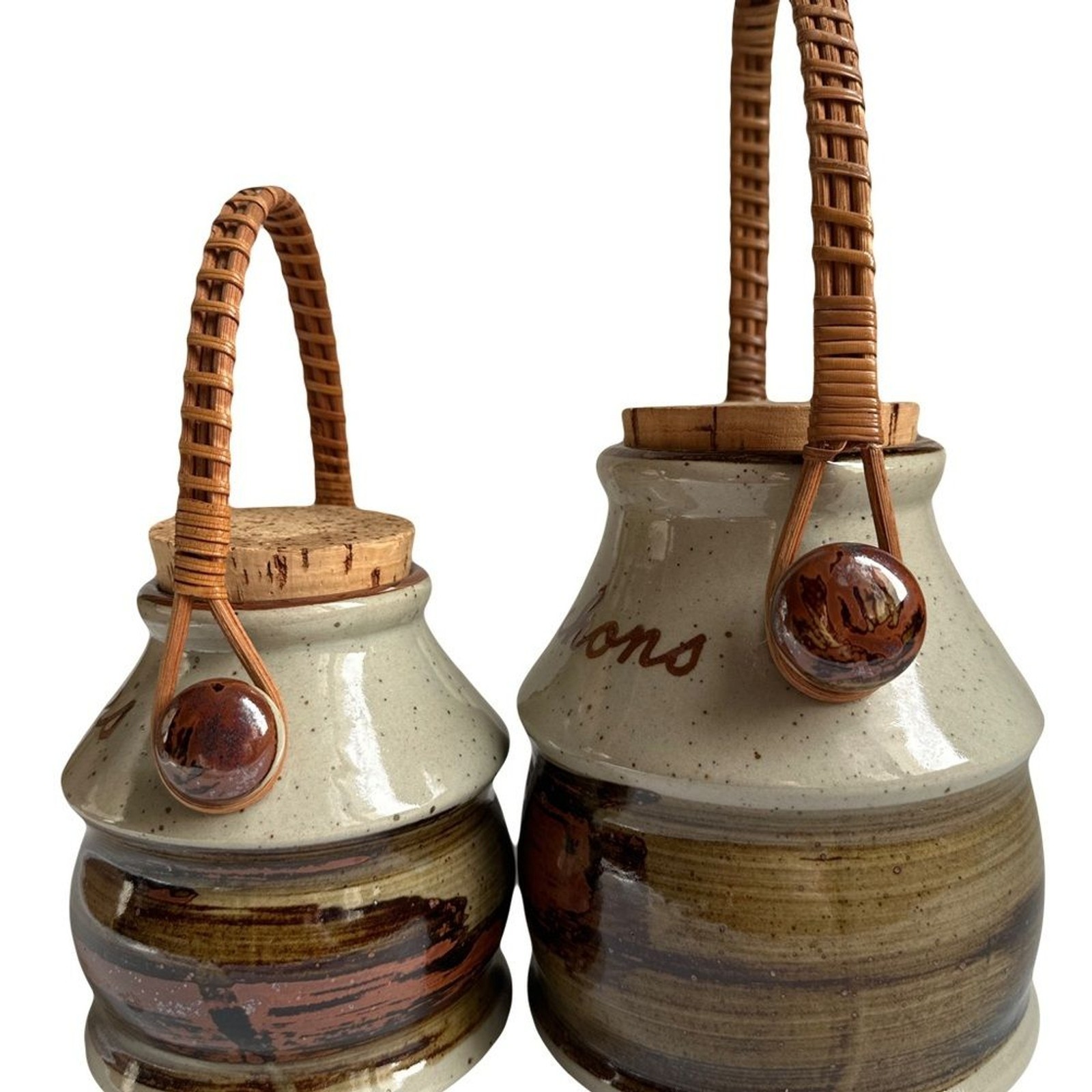 Vintage Rustic Ceramic Olive and Cornichon Jars with Wicker Handles and Corks
