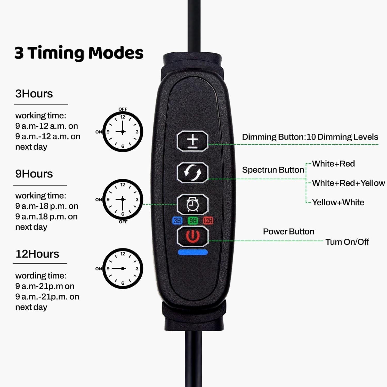?Upgraded Auto ON/OFF Timer: Plant grow lights allows to automatically turn on/off every day according to your settings: 3H(Blue)/9H(Green)/12H(Red). Which requires no manual operation and takes good care of your plants when you on work or vacation.?Please note: The timer needs to be reset if the grow light is powered off.)