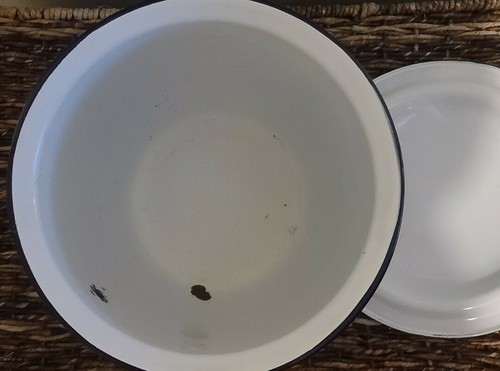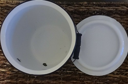 Vintage ~ Enamelware Pot ~ Lid & Handle ~ 9.5" Dia. x 8" Tall ~ White & Black