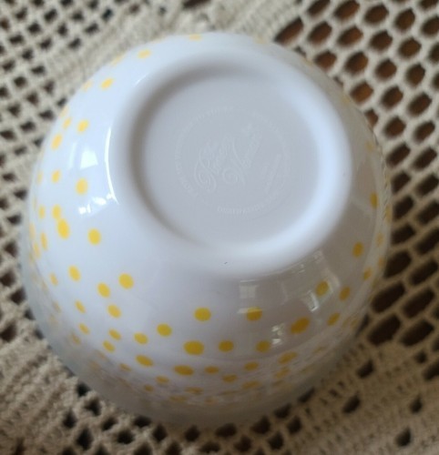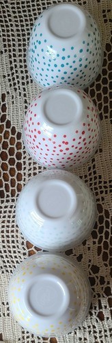 Polka dot pattern throughout each bowl in different colors with a solid white interior
