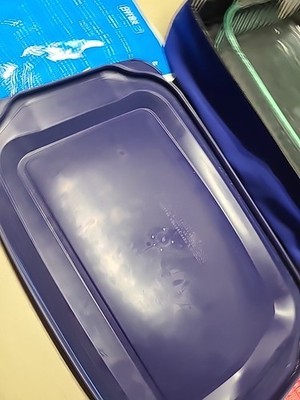 The Pyrex Portables 3 Qt 13x9 Casserole Bake Dish Carrier Set (model 233S) is a versatile baking dish set that includes a blue carrier, clear dish, navy lid, and heat pack. The rectangle-shaped dish is 2 inches in height, 13 inches in length, and 9 inches in width, making it suitable for various baking needs. Made of glass, plastic, and fabric, this set is designed for convenience with features such as being microwave safe, dishwasher safe, and insulated for portability. Perfect for transporting and storing baked goods, this Pyrex set offers both functionality and style for your kitchen.