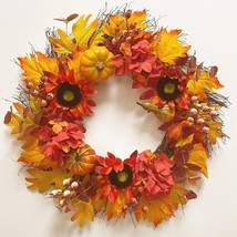 This fall wreath is decorated with colorful pumpkin, maple leaves, sunflower, Hydrangea, pomegranate fruit bunches, golden needle leaves, decorated your home.