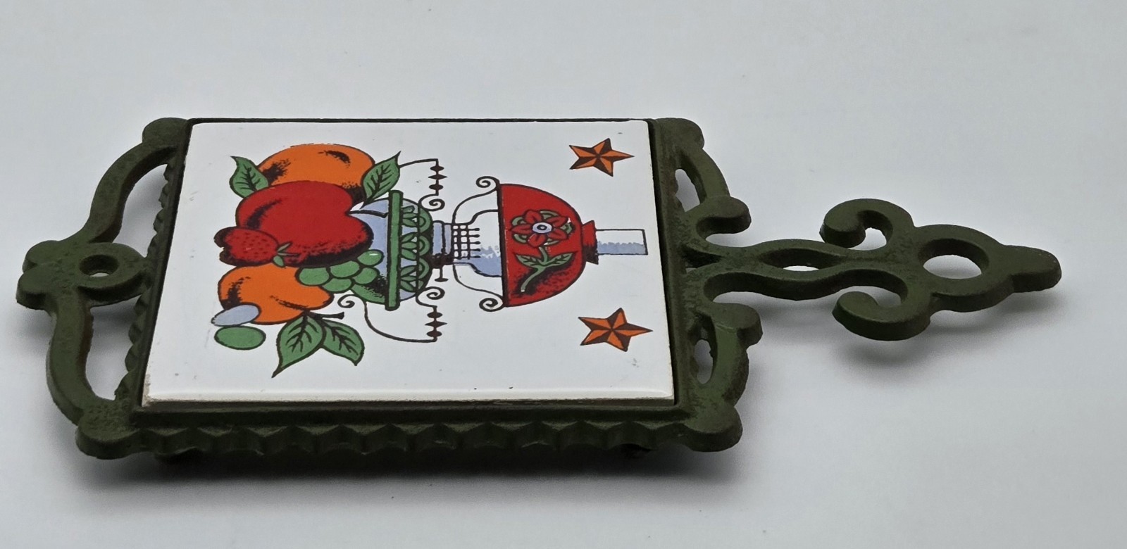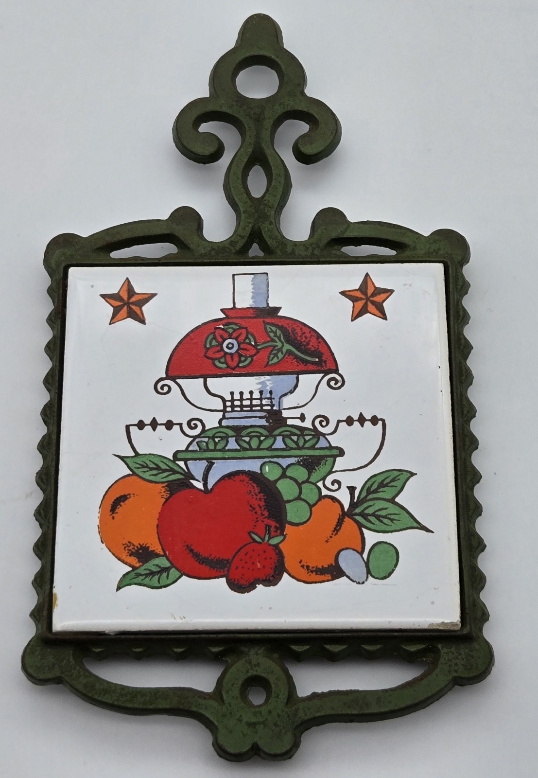 Add a touch of vintage elegance to your kitchen with this charming Japanese-made trivet featuring a ceramic tile center with an oil lamp and fruit motif?beautifully framed in classic cast iron.