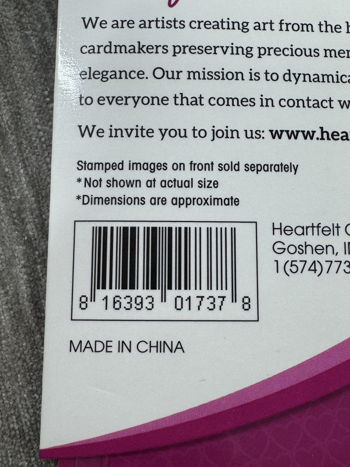 Notes from packaging: Stamped images on front sold separately; Not shown at actual size; Dimensions are approximate; Instructions included