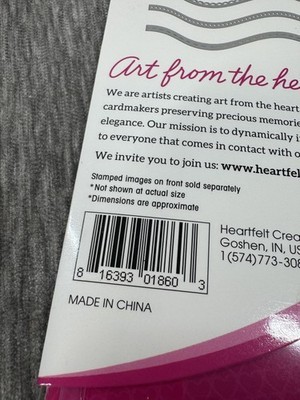 Manufacturing info: Heartfelt Creations, Goshen, IN, USA; Made in China