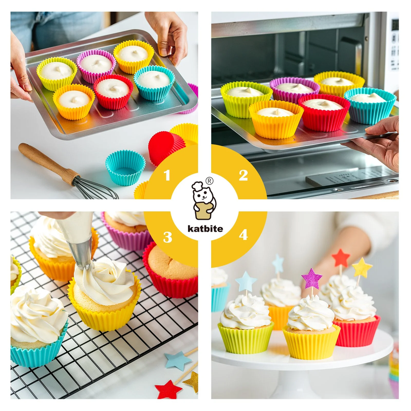 Katbite Silicone Baking Cups are made of high quality 100% food-grade silicone. These baking cups are great for making cakes and have a sixs of color(red,orange,yellow,green,blue,purple)options, separate food in lunch boxes, used in oven, microwave, steamer, air fryer, and widely used for parties, home gathering, bakery store, cartoons, weddings, Xmas etc.