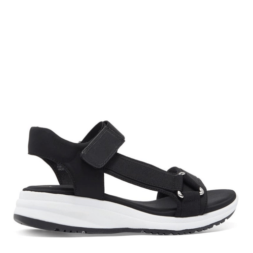 A sporty wedge sole adds comfort to an open toe sandal that is created with summer in mind.
