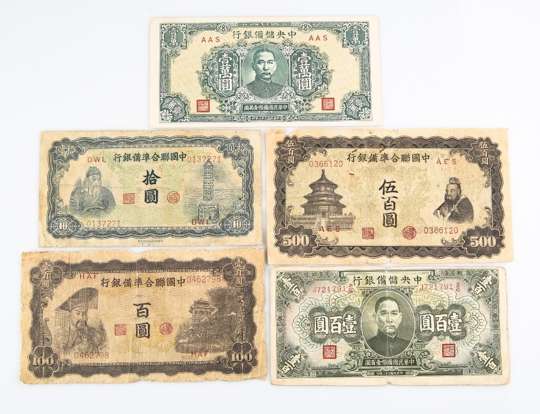 1943 (ND) China 10 yuan note (10?) No date (ND) printed on note Dimensions: 160 x 85 mm Serial number: 0137271 Catalog number: Pick#J-76a 1943 (ND) China 100 yuan note (100?) No date (ND) printed on note Dimensions: 174 x 94 mm Serial number: 0462798 Catalog number: Pick#J-77a 1943 China 100 yuan note (100?) Printed date of 1943 Dimensions: 169 x 84 mm Serial number: J721791 Z/G Catalog number: Pick#J-21a 1943 (ND) China 500 yuan note (500?) No date (ND) printed on note Dimensions: 177 x 98 mm Serial number: 0366120 Catalog number: Pick#J-78 1944 China 10,000 yuan note (10,000?) Printed date of 1944 Dimensions: 169 x 84 mm Catalog number: Pick#J-38a *Expected grades are approximate. California Buyers: Returns Policy: About Us: Monday ? Friday, from 10:30am ? 6:00pm PST Reference Item # F