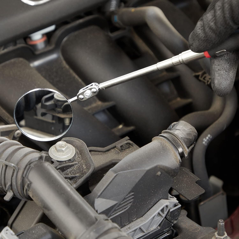 Telescoping Mirror Versatility: This mechanic mirror features an extendable stick that reaches up to 24.5 inches and retracts to 6.4 inches, providing easy access in and around hard-to-reach areas, ideal for HVAC tools and machinist tools