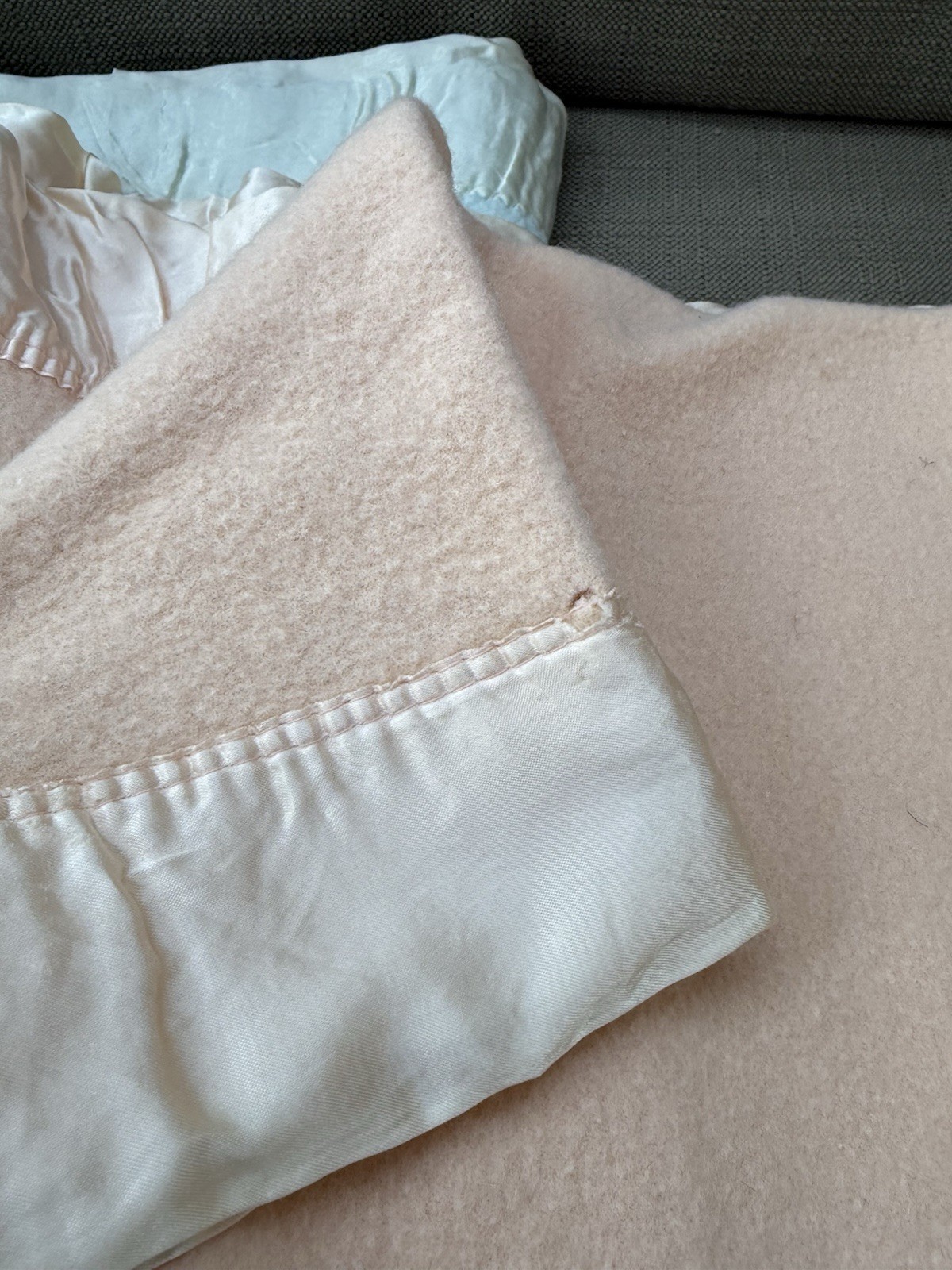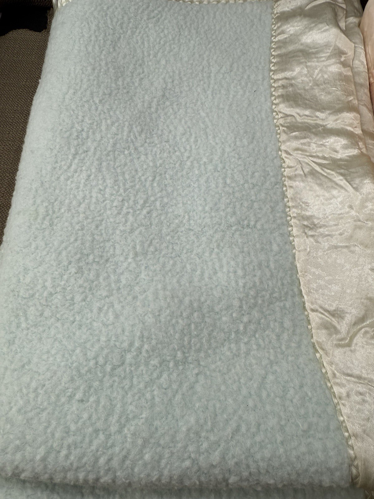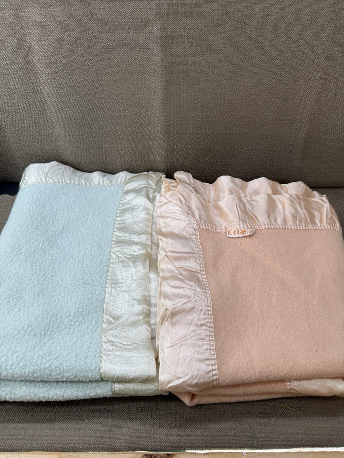 3245. Vintage Mid-Century Baby Blanket Lot ? North Star Pink Wool Blue Satin Trim