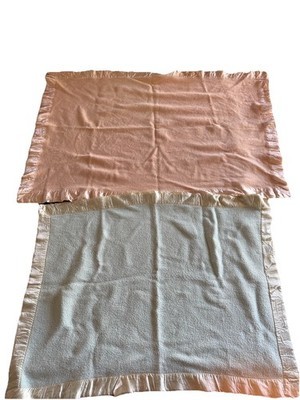 Lovely pair of vintage baby blankets from the mid-20th century, featuring soft pastel hues and classic satin trim.