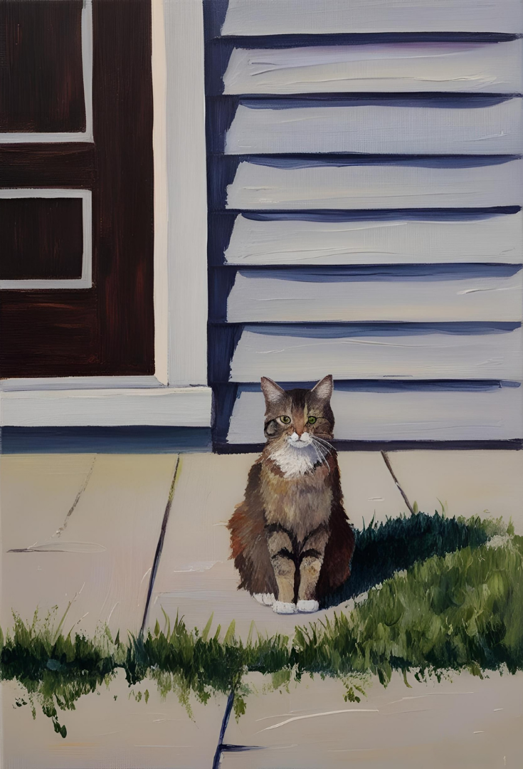 “Paws on the Porch” is a grounded portrait capturing the simplicity of a suburban life. In it can be seen a tabby cat with a curious look on its face. Behind it is a house painted in whites, forming a crispy and geometric backdrop contrasting with the cat’s colors, making it stand out. This piece was made in a painterly manner and gives a sense of familiarity, portraying a daily life scenery.