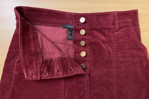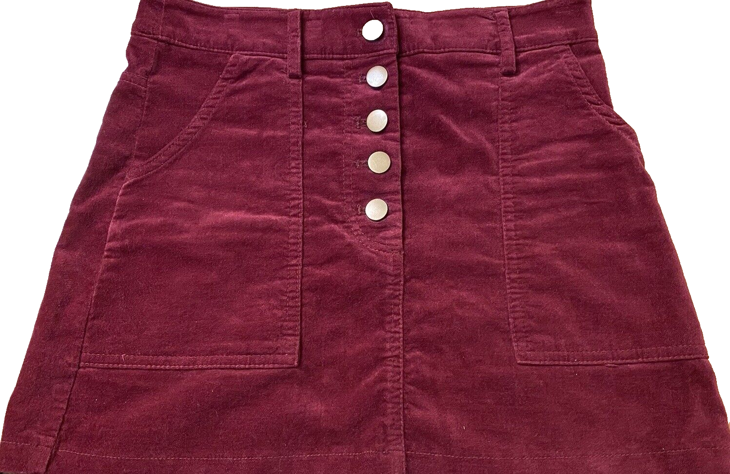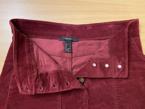This mini skirt from Forever 21 is made of a soft velvet fabric in a beautiful wine/burgundy color. It has a button closure and features pockets, making it both stylish and practical. The skirt is perfect for a variety of occasions, from formal events to casual outings and parties. The size of the skirt is small and it is intended for juniors. The material is a blend of spandex and cotton, ensuring a comfortable fit. The skirt length is short, making it ideal for winter and fall seasons.