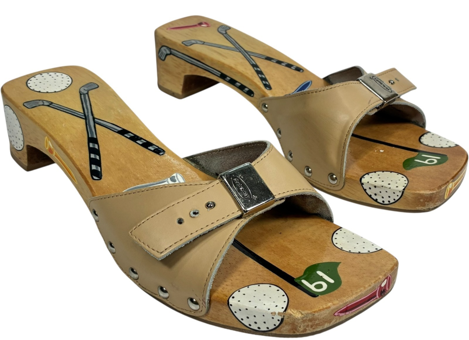 Dr. Scholls 19th hole Golf Theme Wooden Sandals Tan Leather Upper 482DS11 women's 10M