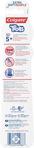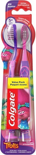 Colgate kids trolls manual toothbrush is a fun way to encourage good oral care habits early on! it is specially designed for children with both baby and adult teeth. It includes a suction cup for easy and fun upright storage, a thumb grip and rounded handle for a comfortable grip, and our unique soft tongue cleaner on the back of the toothbrush head to clean beyond teeth.