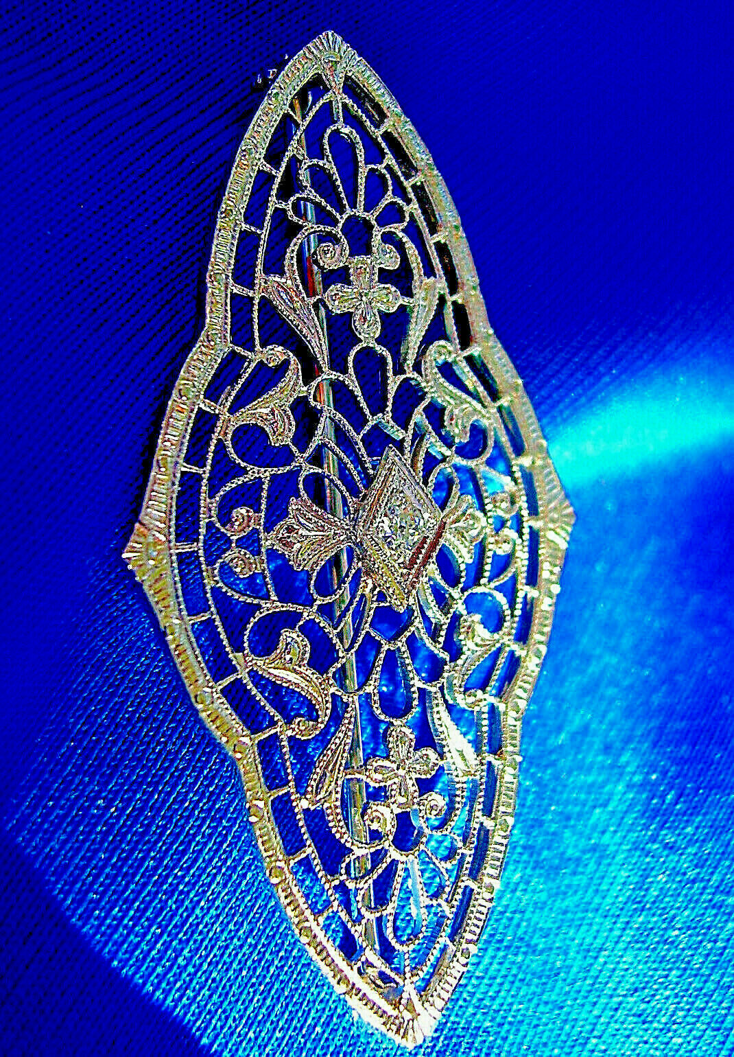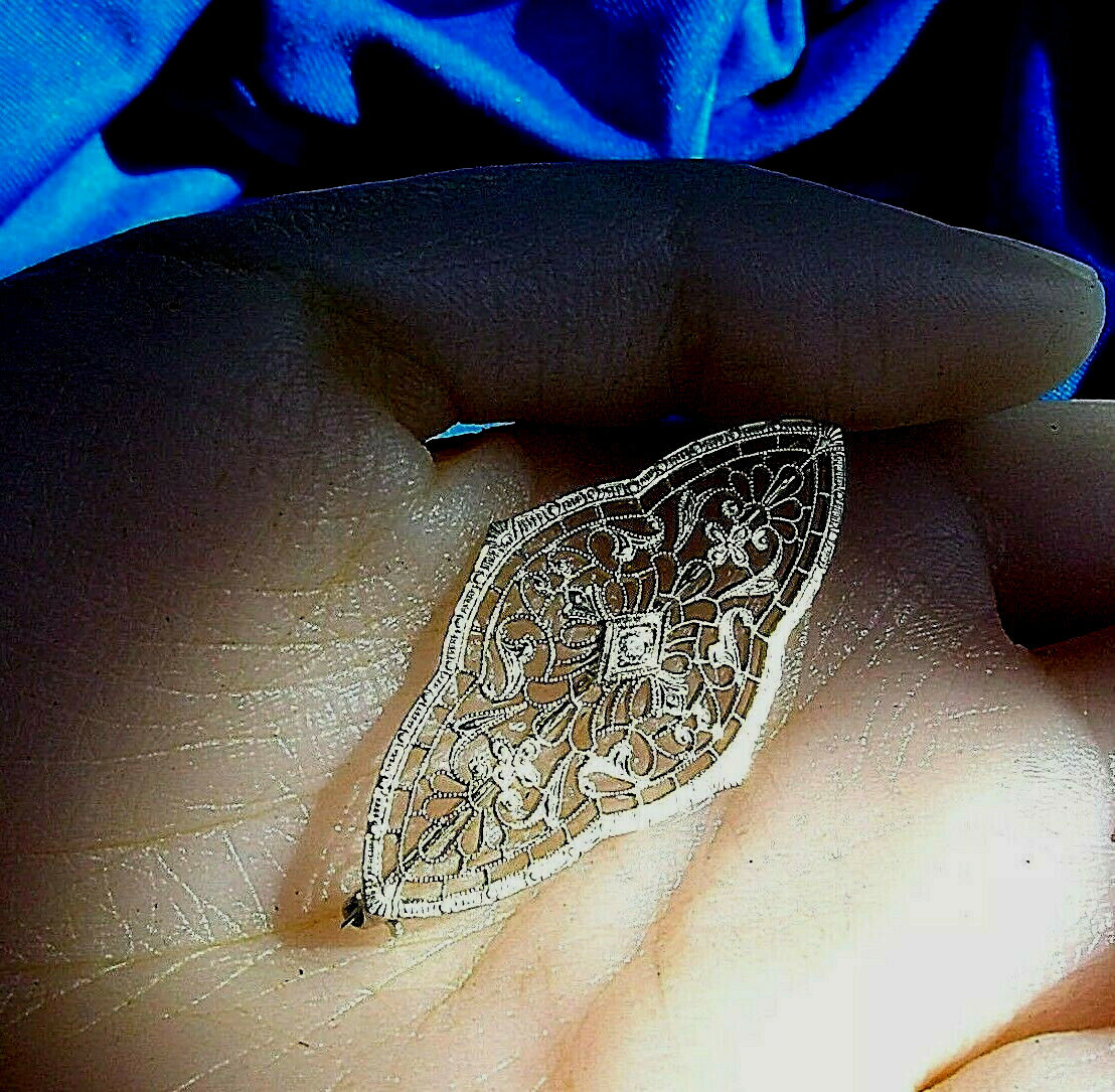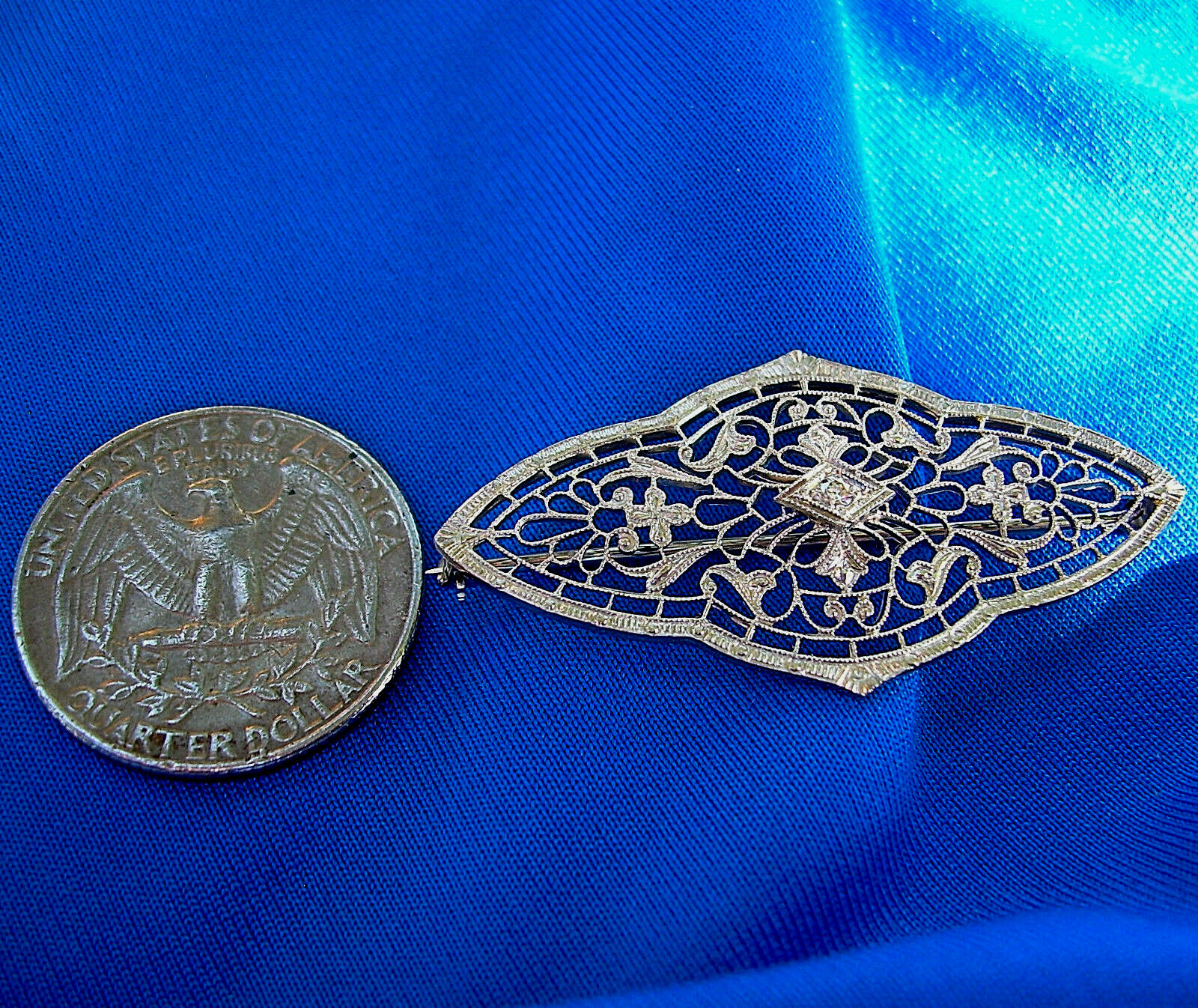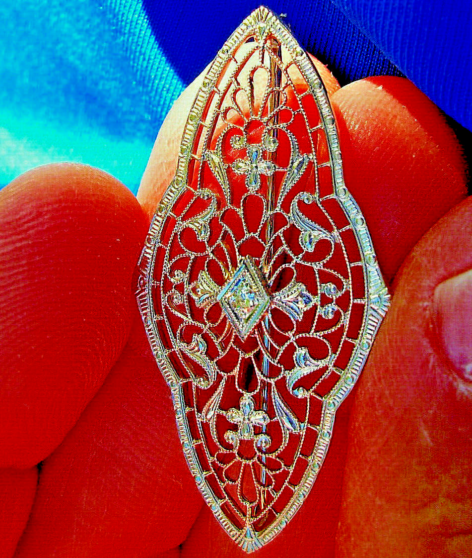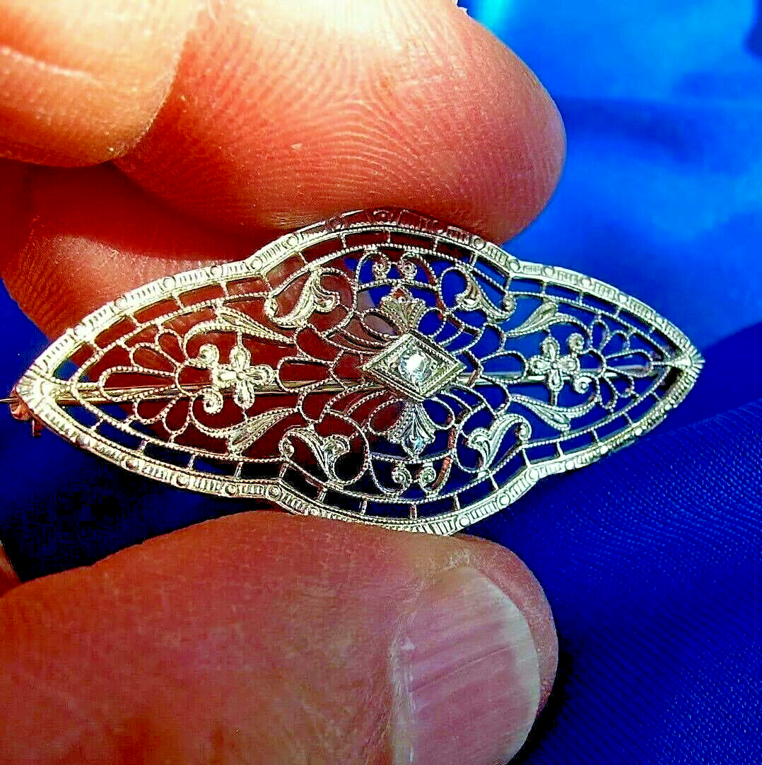 Earth mined Diamond Deco Filigree Brooch Gatsby era Antique Solid 14k White Gold