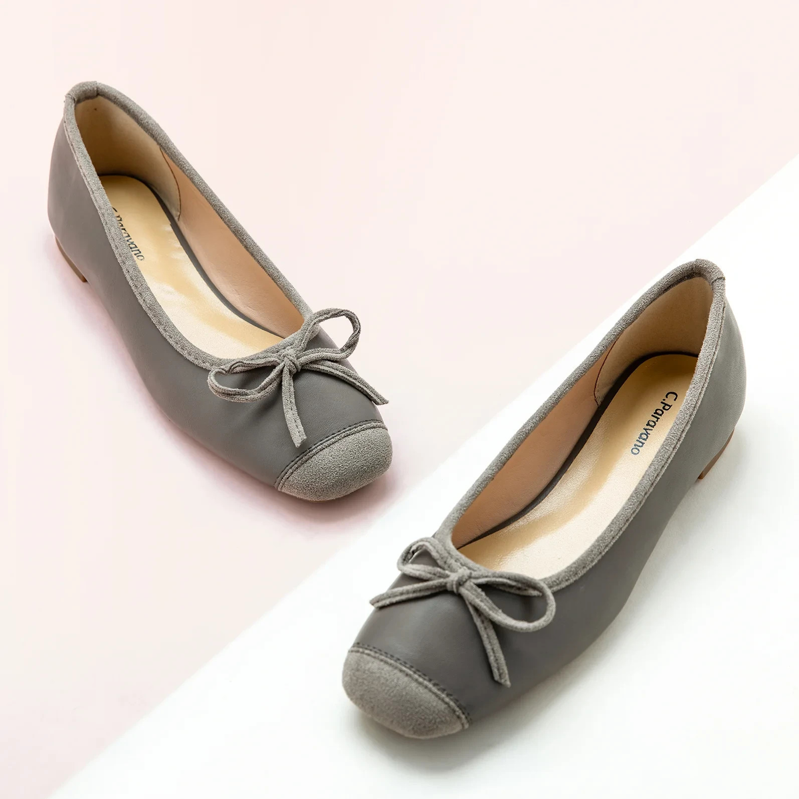Features a squared-toe ballet flat, a subtle yet distinctive element that adds a touch of modernity to the classic design. The splicing design of the toe and the shoe body presents a structuralist aesthetic.