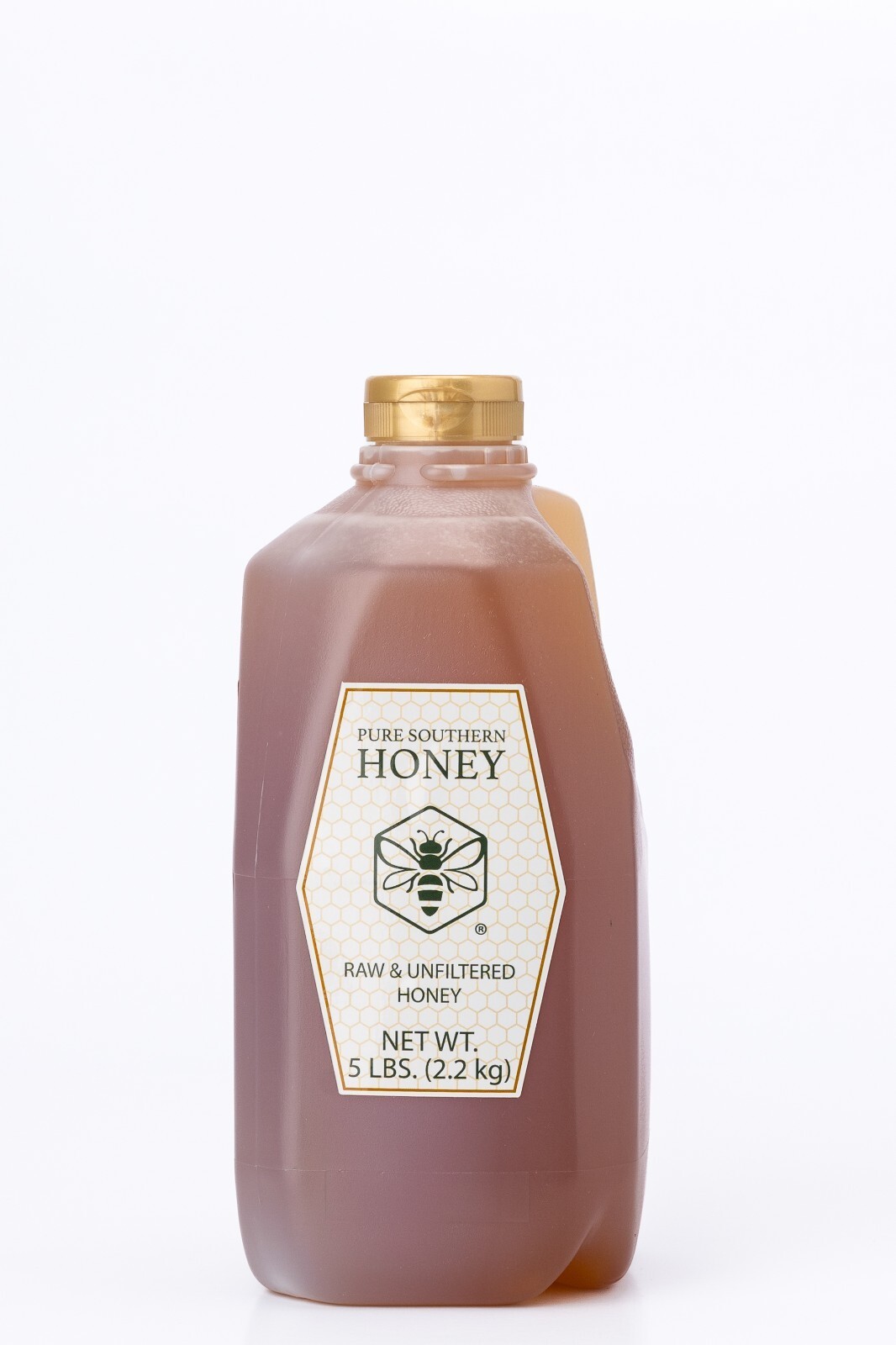 Pure Southern Honey is 100% raw, unfiltered, and never heated. This wholesome honey derives from a range of floral sources native to Southeast Georgia, consisting of mainly Gallberry with some Tupelo, Blackgum, and Palmetto flowers. It is unique in its natural flavor and that it does not crystallize quickly, giving itself a longer shelf life compared to average honey?s. Our five pound carton is packaged in a handy pour jug with flip top.