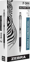 Zebra Pen F-301 Retractable Ballpoint Pen is sleek, sophisticated and easy to sanitize. This hard-working metal pen brings industry-leading precision and stability to your writing. The refillable F-301 has a metal plunge, clip and cone for an executive look. Retractable ballpoint pen has black ink and a 1.6mm bold point tip. Corrosion resistant, stainless steel barrel is easier to sanitize than plastic. Shorter barrel slips easily into shirt pockets. Comfort grip matches barrel accents. Metal clip readily attaches to a notebook, planner, work bag or briefcase pocket. This 12-count pack of attractive pens is perfect for home, school or office. Clean and stylish, this trusted pen is suitable for boardrooms, courtrooms, classrooms, medical settings, offices and job sites. It?s the right pen for any job.