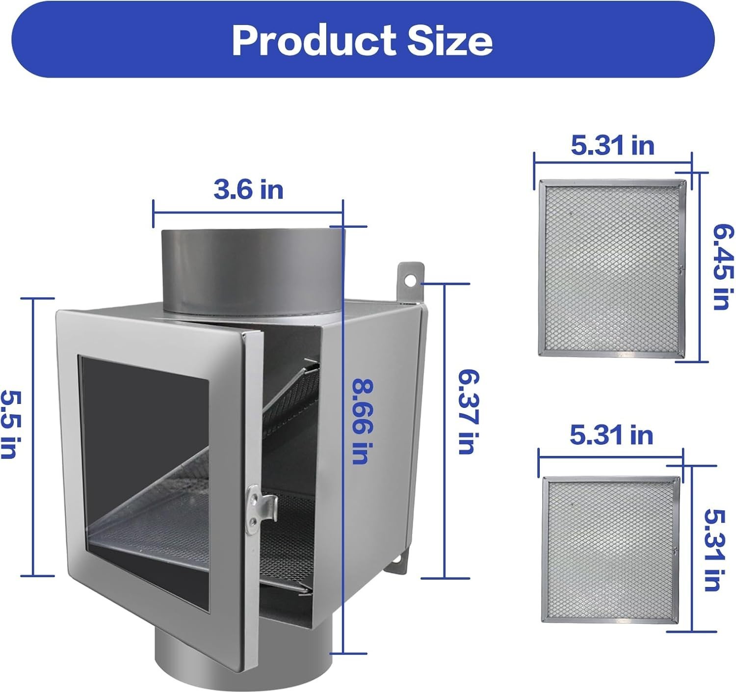 : The lint trap for dryer vent features a sturdy metal material, Have offers superior durability and rust resistance, It withstands high temperatures and able to resist wear and tear in long-term use, and used for a long time without deformation or damage.