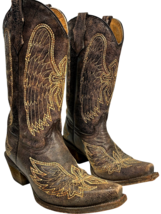 Brown Crackle Cowhide Foot Upper. 10" Upper w/ Pull Straps. Gold Stitched Winged Cross Design on Foot Front Back of Upper. Gold Stitched Wing Design on Heel Counter. Soft Leather Lining. Snip Toe style. Cushioned Insole. Leather Outsole. 1 3/4" Lightly Cushioned Riding Heel. Single Stitched Welt.