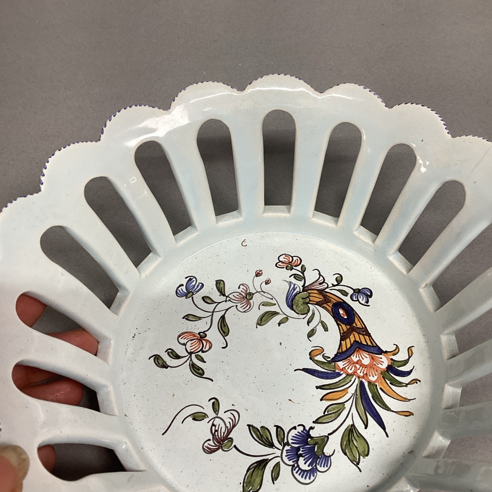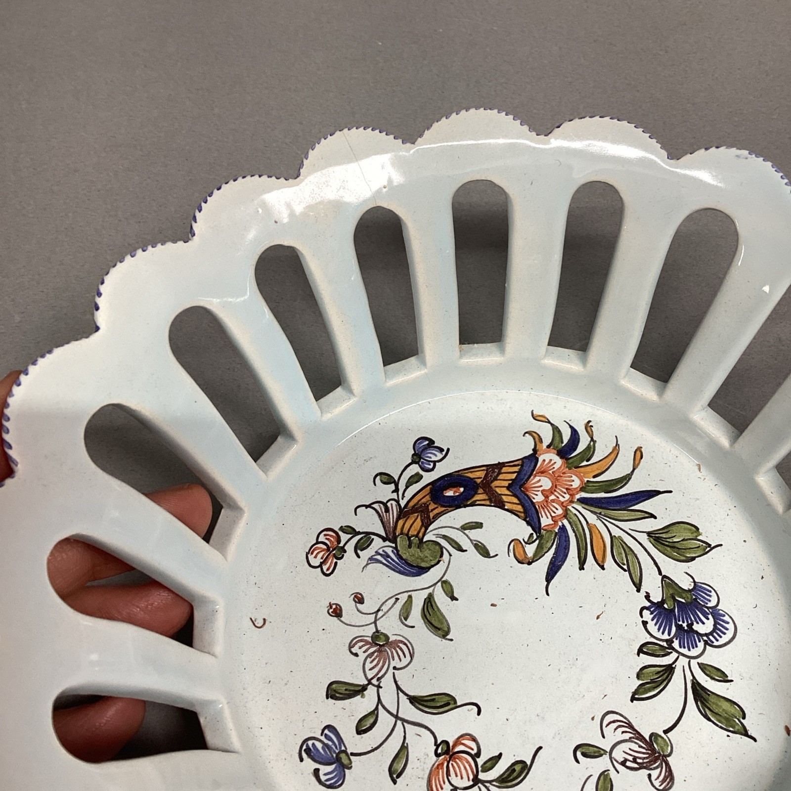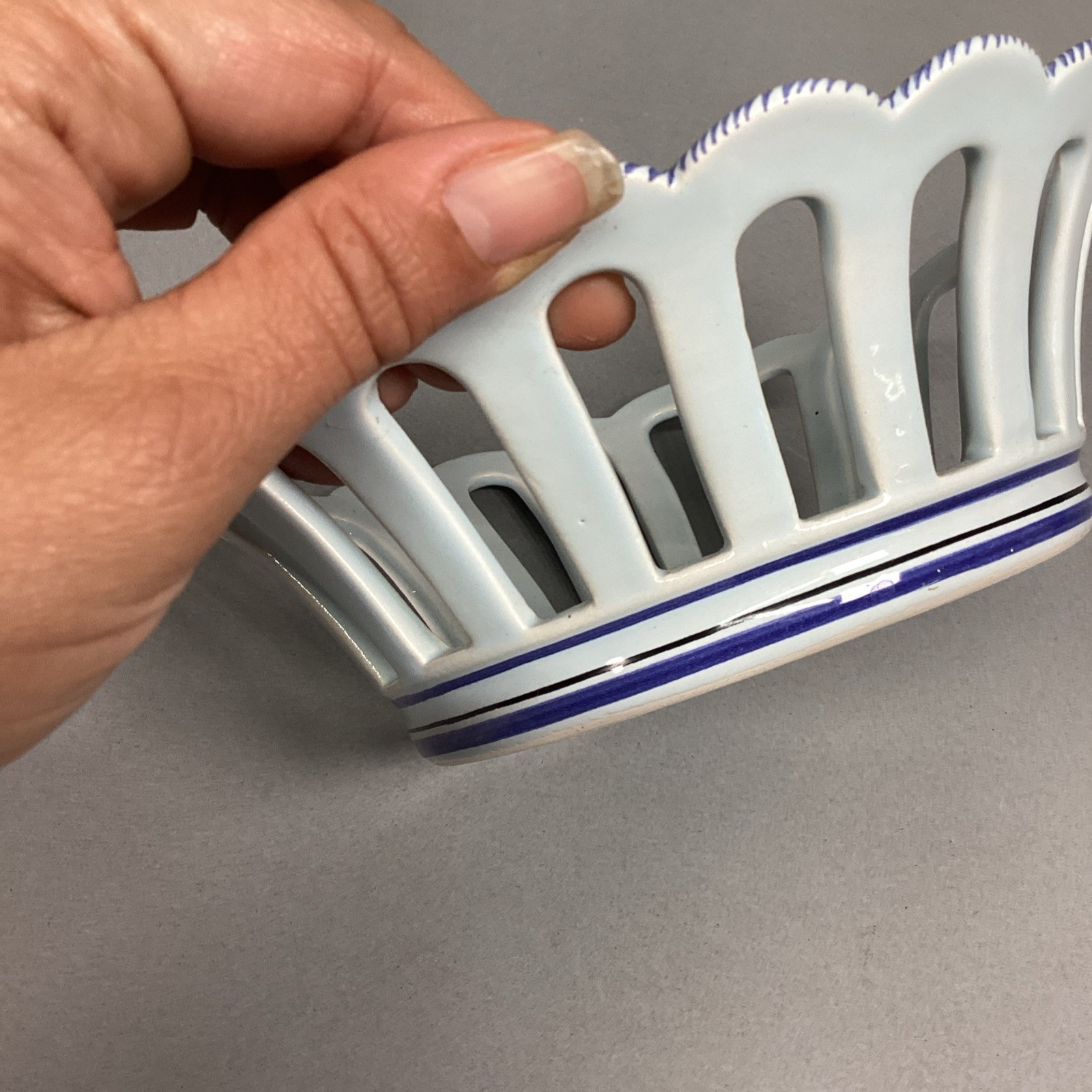 French Made Decor Rouen Fait Main Reticulated Floral Basket - 7?D. In used condition. There are no cracks or chips in the basket. There are some marks and stains from age and use.