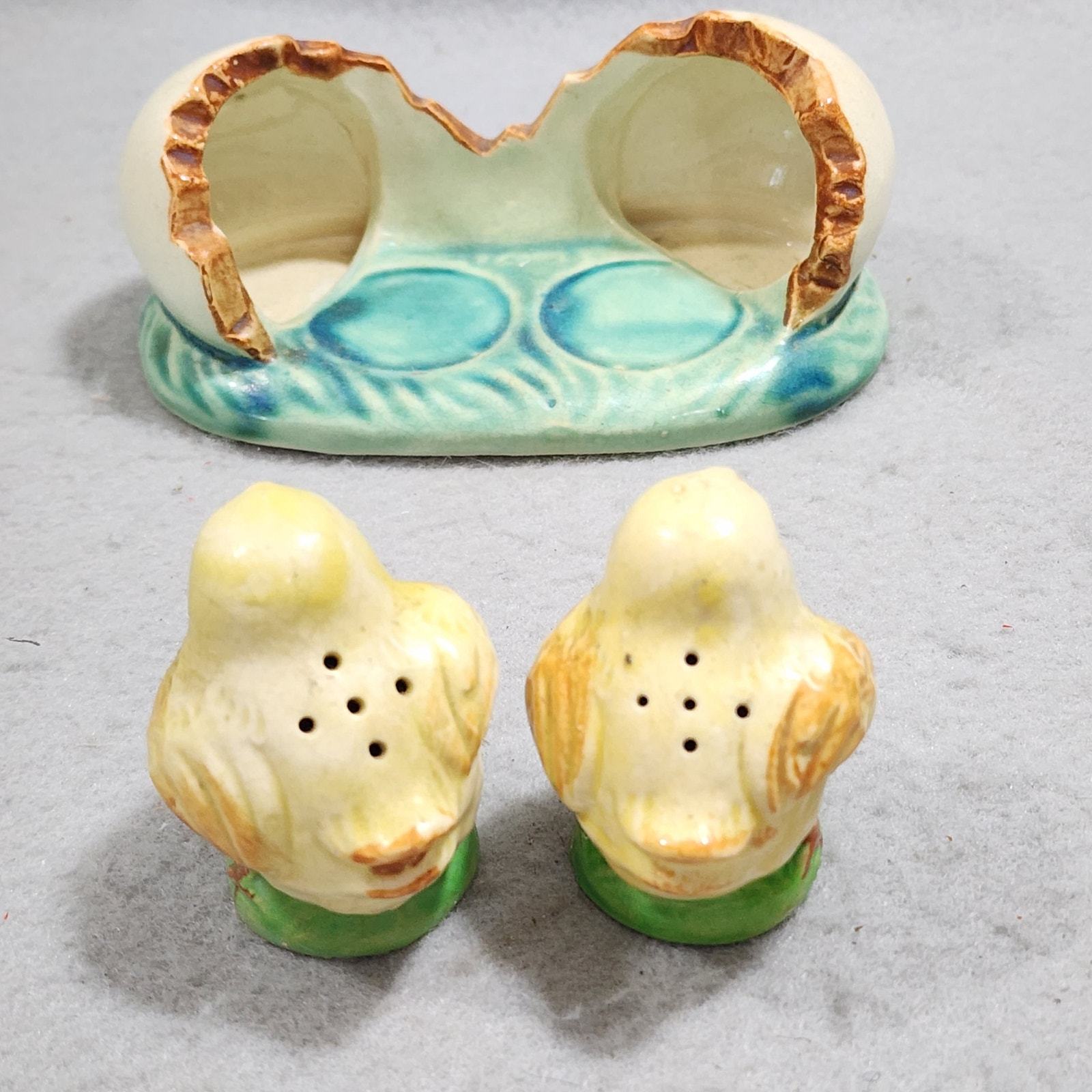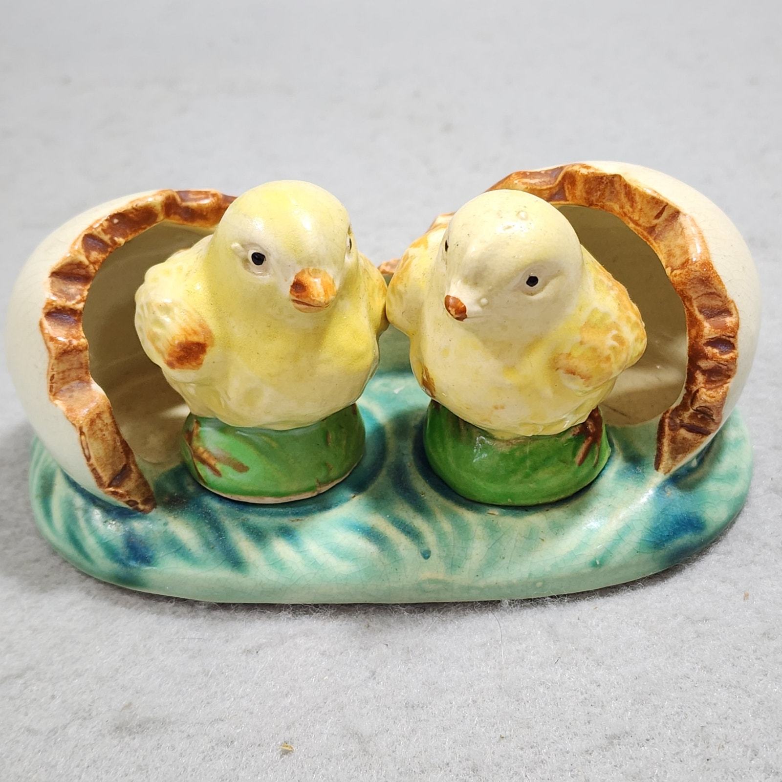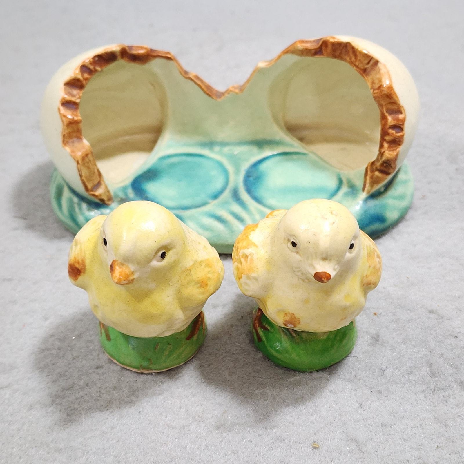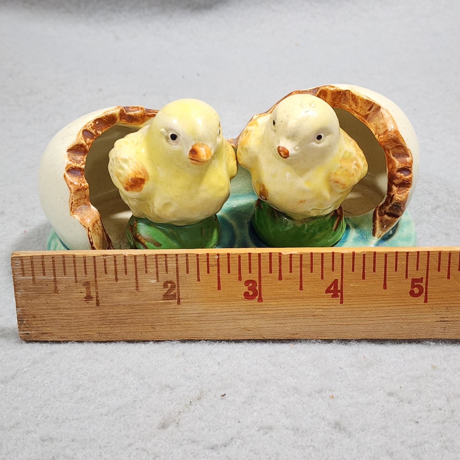 Hatched Baby Chick's Salt & Pepper Shakers With Broken Hatched Eggs Holder Vtg
