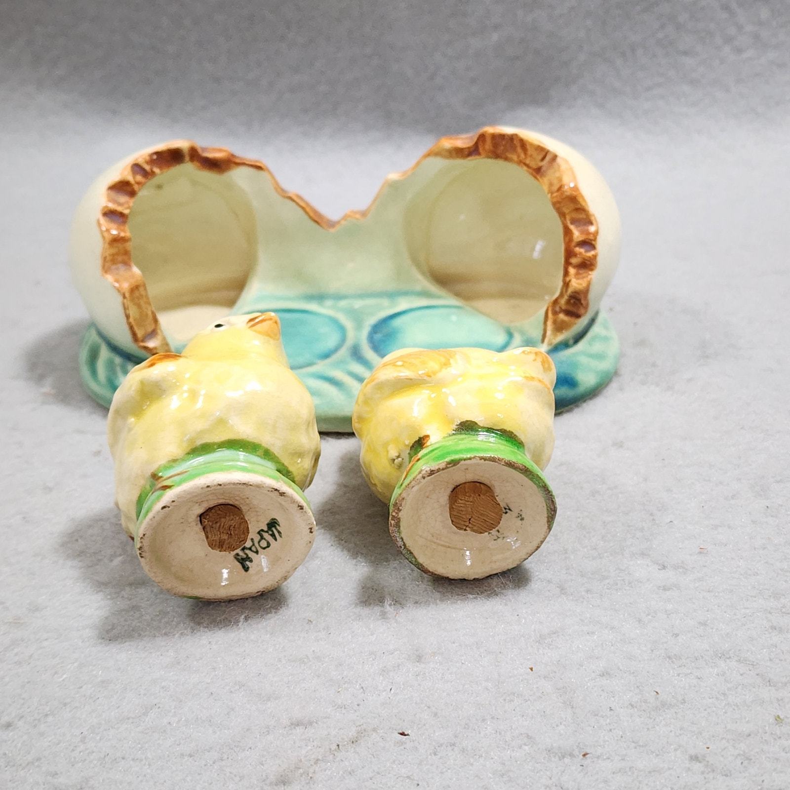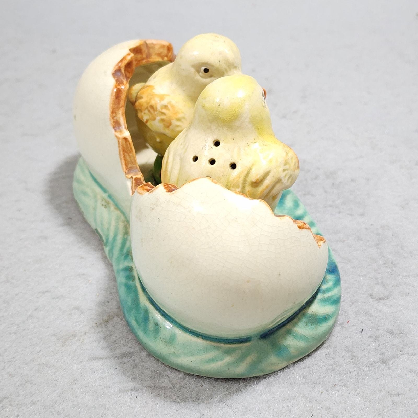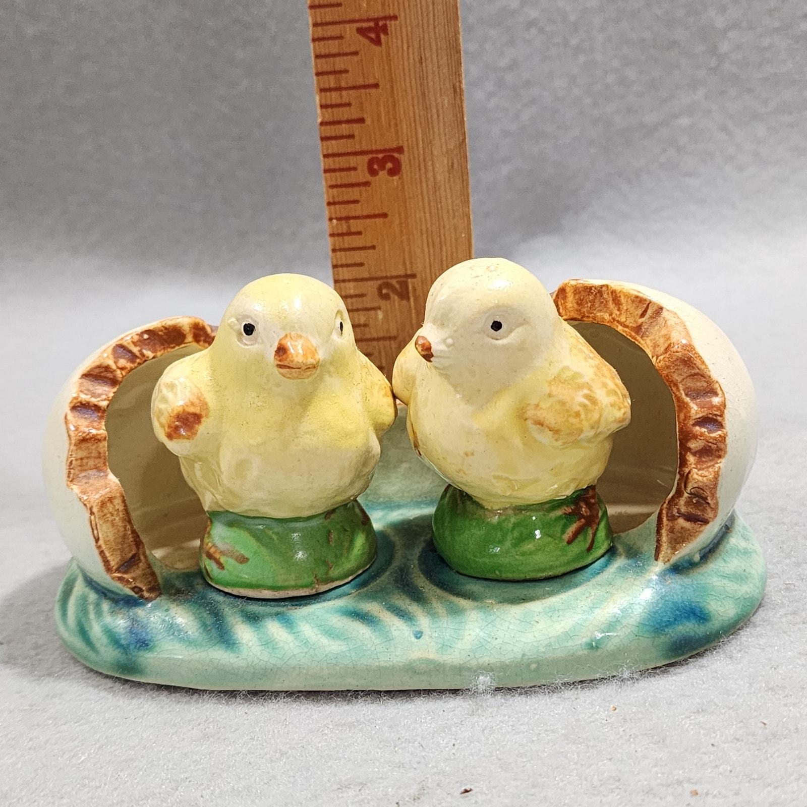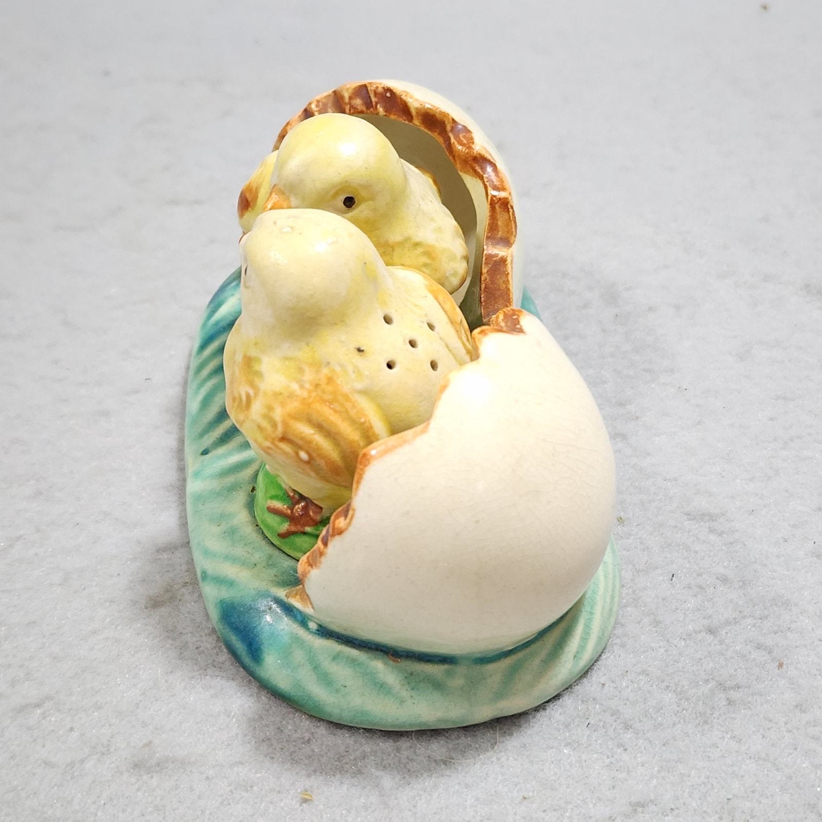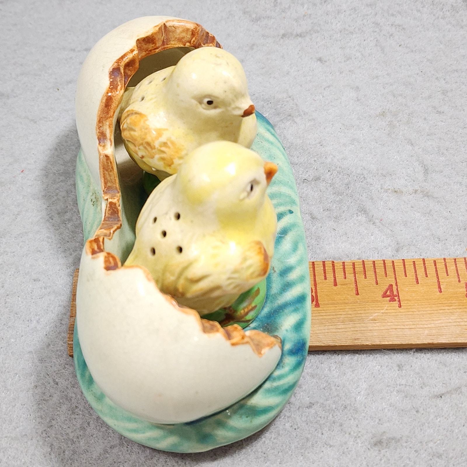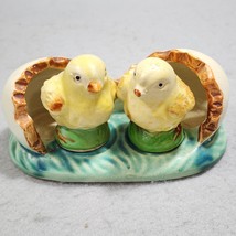 Hatched Baby Chick's Salt Pepper Shakers With Broken Hatched Eggs Holder Vintage - Both shakers have their cork stoppers.