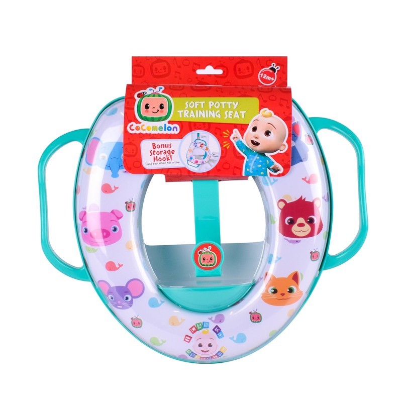 Your toddler can potty train along with JJ and the gang! Help take the stress out of potty training with this unisex CoComelon Soft Potty Training Seat. This cushioned potty seat is inspired by the popular nursery rhymes from the educational YouTube series, CoComelon. JJ and the gang will cheer on your child with "I Can Do Anything" motivation. Designed with signature graphics, soft padding and built in handles this potty seat is the perfect tool to help your toddler learn how to use the adult toilet. Parents will love the bonus storage hook that will keep the seat off the floor and on toddlers minds. The hook sits flat on the side of the toilet when not in use. Kids will love using the big kids potty, washing their hands and doing the potty dance with their favorite CoComelon characters!