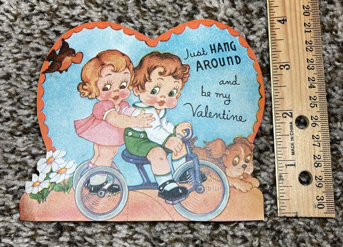 Vintage Valentines Day Card Boy Girl on Tricycle Dog Just Hang Around