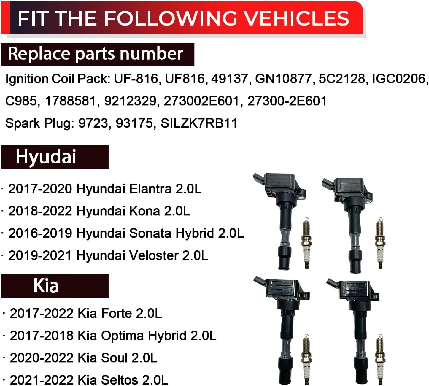[Reference Number] Ignition Coil Pack: UF-816, UF816, 49137, GN10877, 5C2128, IGC0206, C985, 1788581, 9212329, 273002E601, 27300-2E601; Spark Plug: 9723, 93175, SILZK7RB11. Package included: 4*Ignition Coil Packs , 4*Double Iridium Spark Plug [Vehicle Fitment] The lgnition coil packs and spark plugs set compatible with Hyundai Elantra 2017-2020, Kona 2018-2022, Sonata Hybrid 2016-2019, Veloster 2019-2021; Compatible with Kia Forte 2017-2022, Optima Hybrid 2017-2018, Soul 2020-2022, Seltos / Forte5 2021-2022------2.0L [Superior quality] Ignition Coil pack is made of high quality material and spark plug is double iridium spark plug, with good heat dissipation performance, and can resist the heat and thermal cycle caused by the fracture, so as to better transfer the high voltage generated by the spark plug, to ensure the accuracy of the ignition time, improve the combustion efficiency, reduce exhaust gas emissions [Enhanced Coil and Spark Plug] Set of 4 Ignition Coil Packs and Spark Plugs. Match with original parts, easy and quick installation, while the new ignition coil, effectively provide the proper voltage to the spark plug electrode, to provide excellent cold start performance and smoother engine running, long service life [Choosing the Right Part] Before buying, research to make sure the part fits your vehicle; enter all vehicle information (year, make, model, engine, and interior) to ensure compatibility, and check the qualifying instructions and that a professional installation is recommended