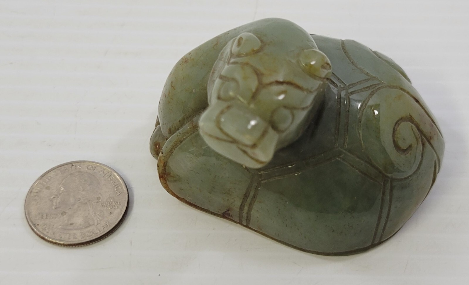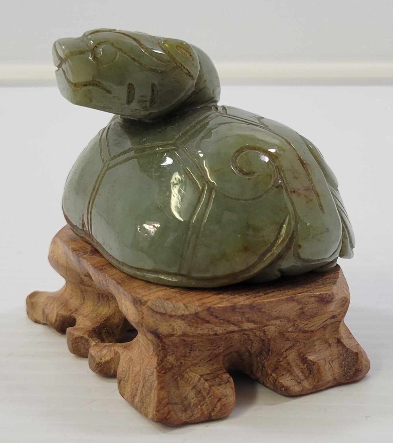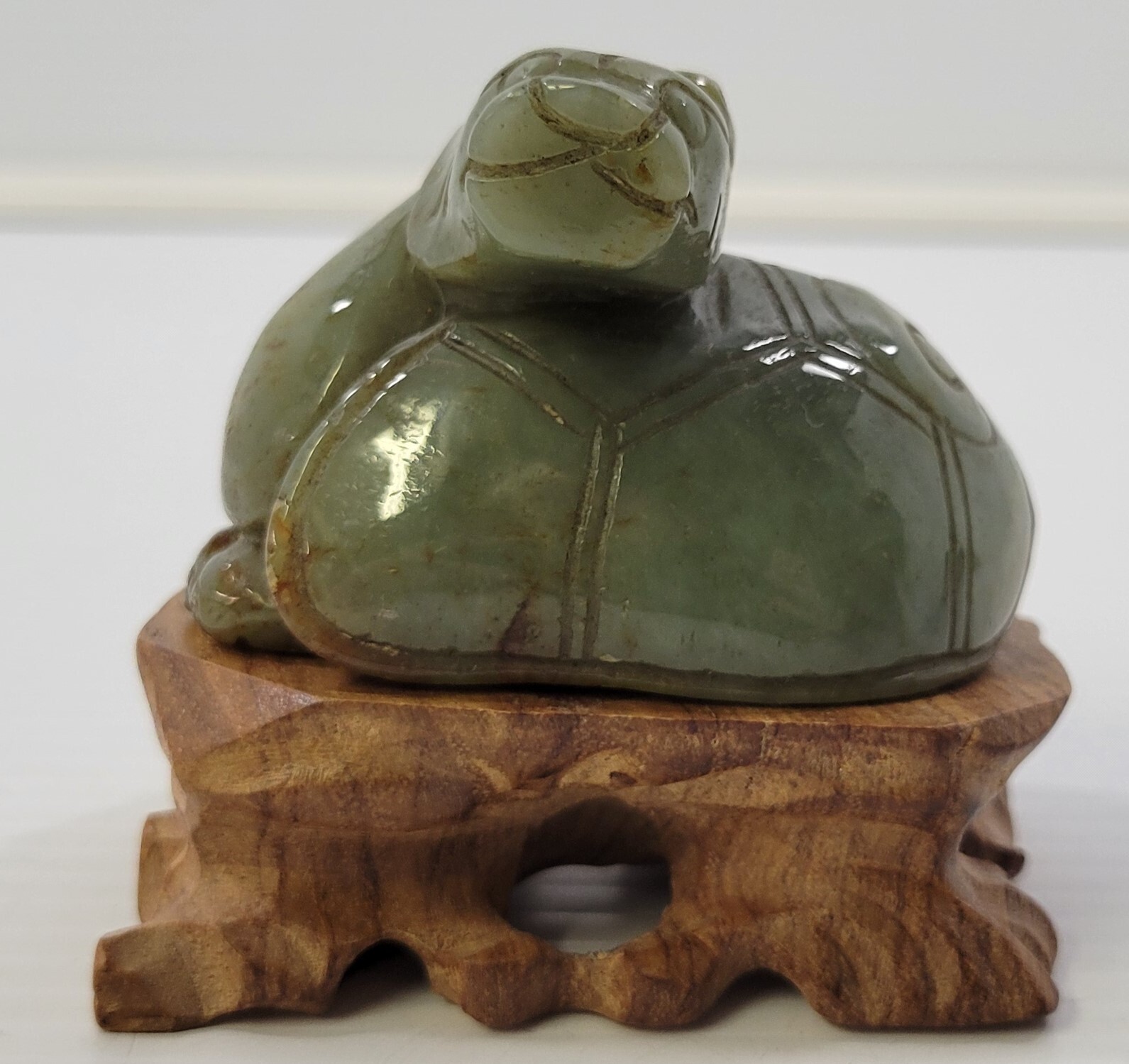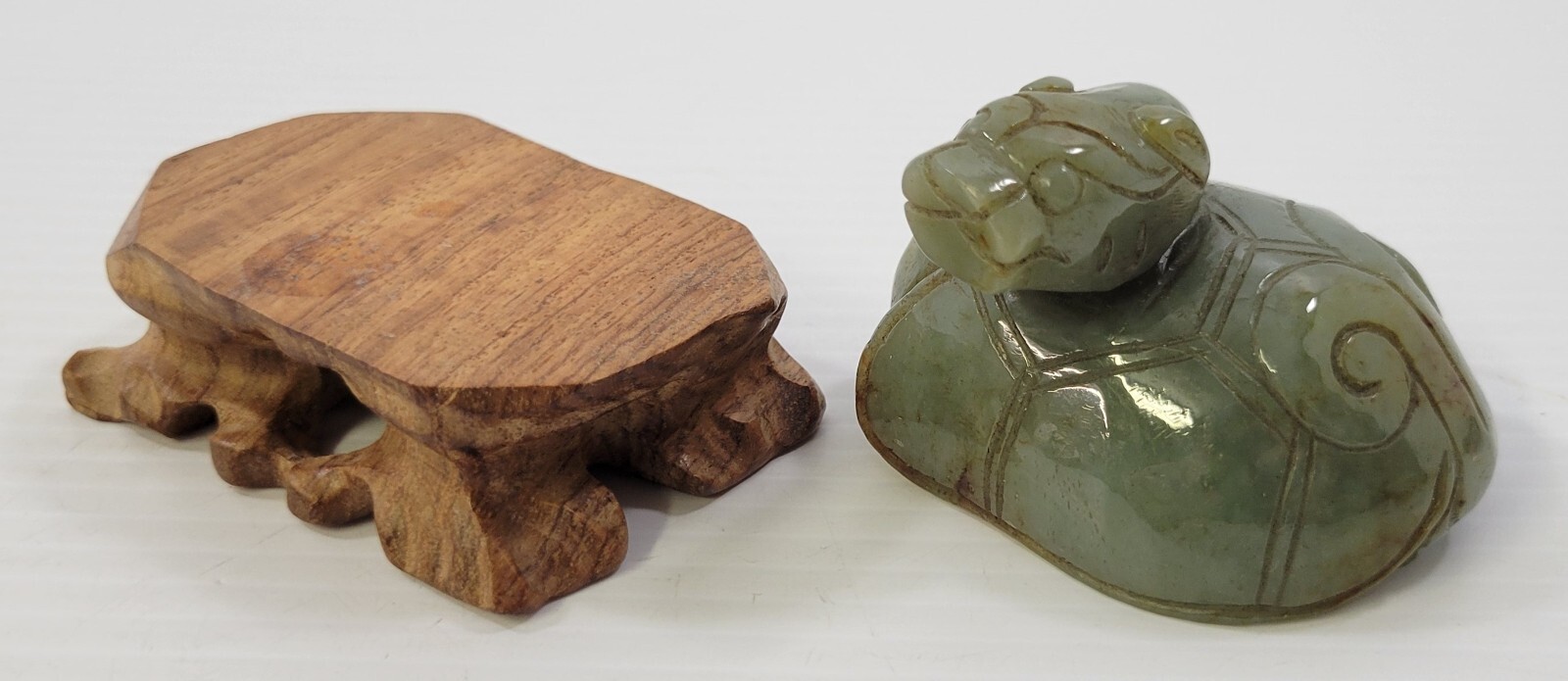 *B2) Antique Chinese Feng Shui Dragon Turtle Jade Statue Figurine on Wooden Base