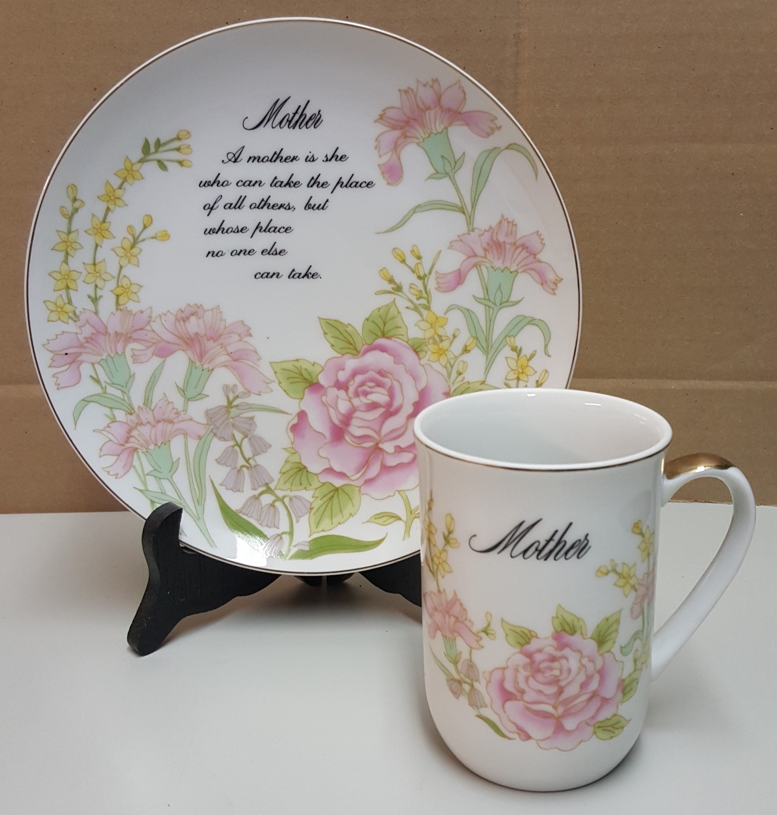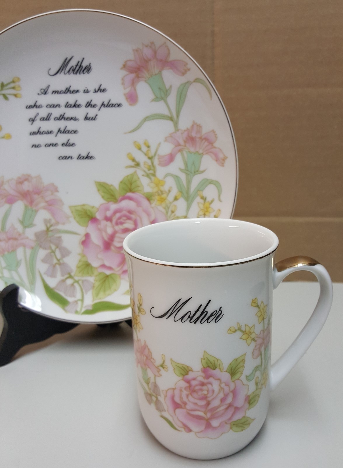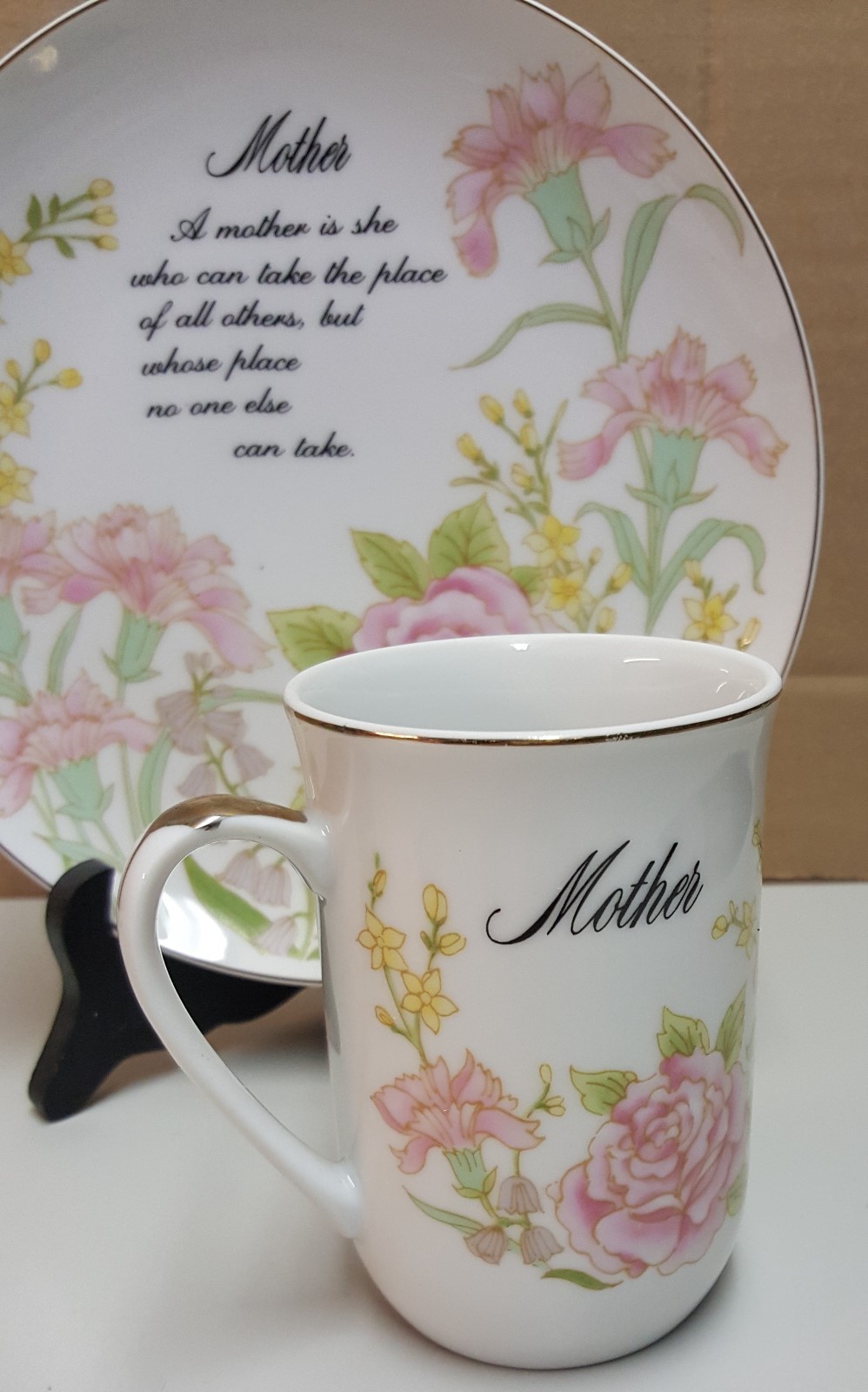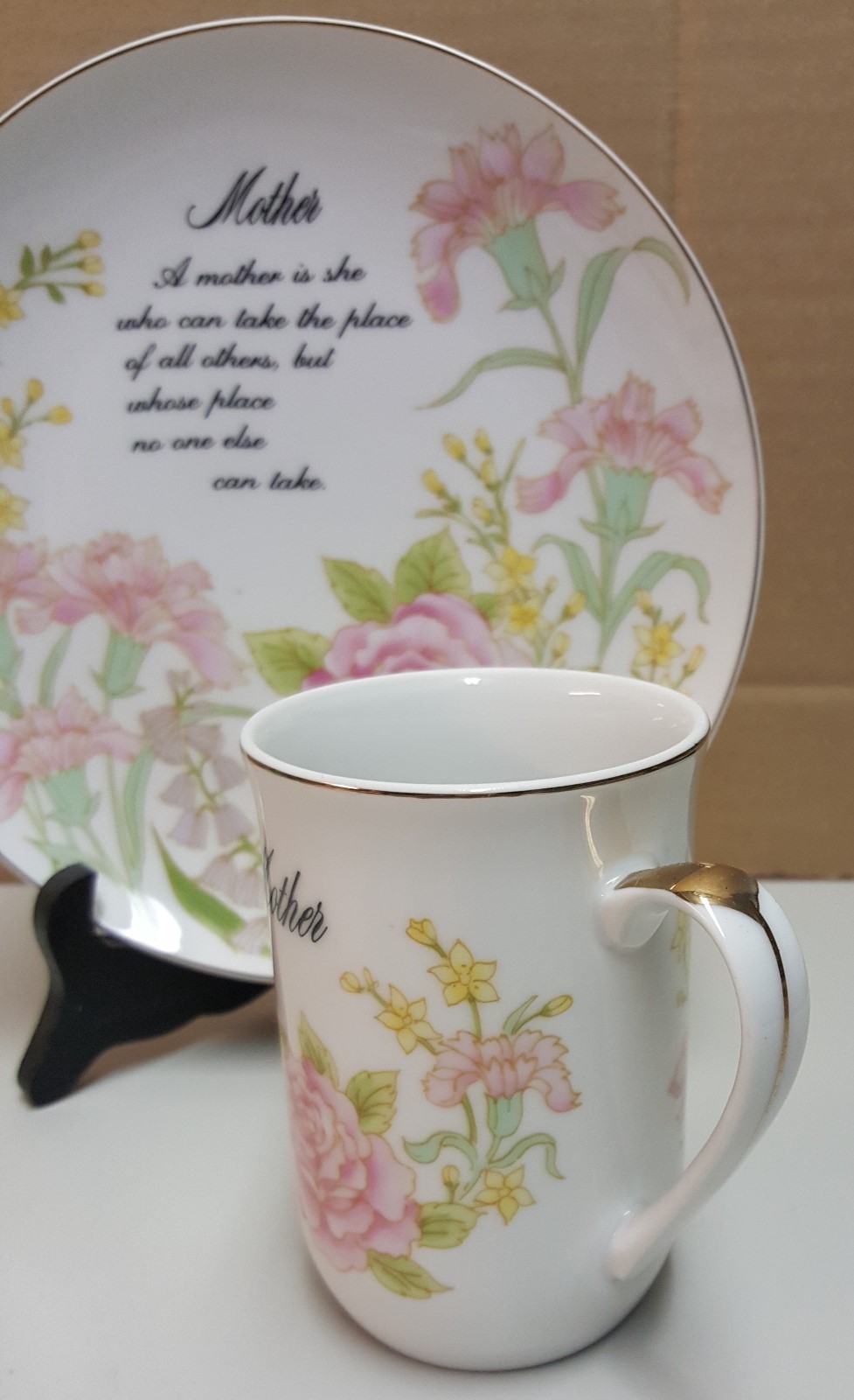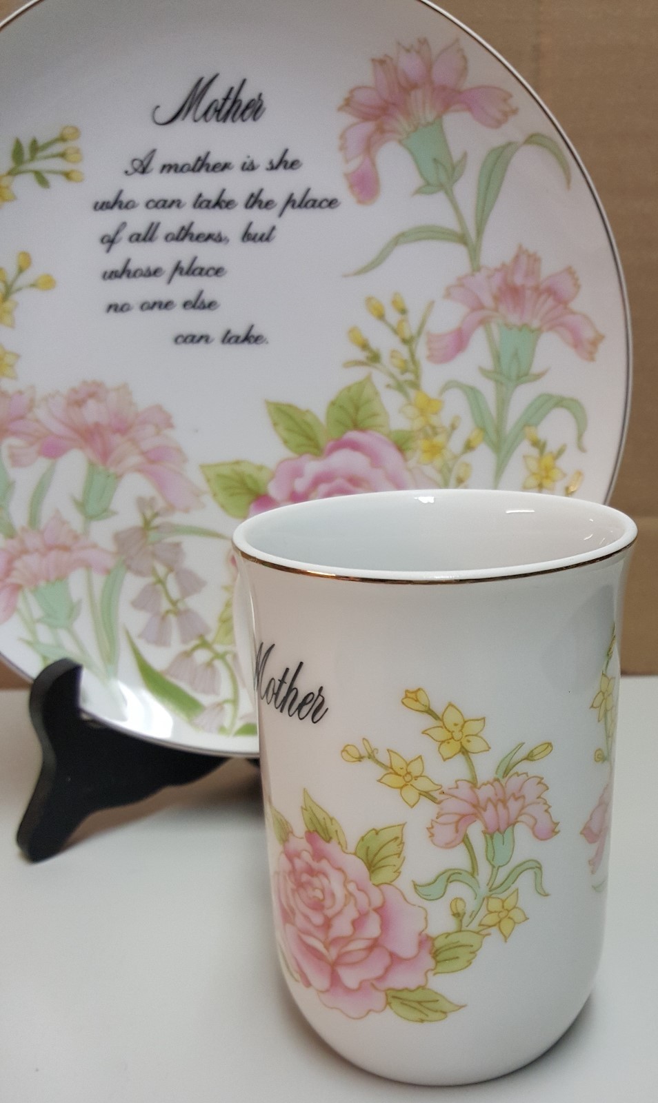 FF) Mother Gift Quote Display Dish Plate Stand and Mug Japan Gold Tone Trim