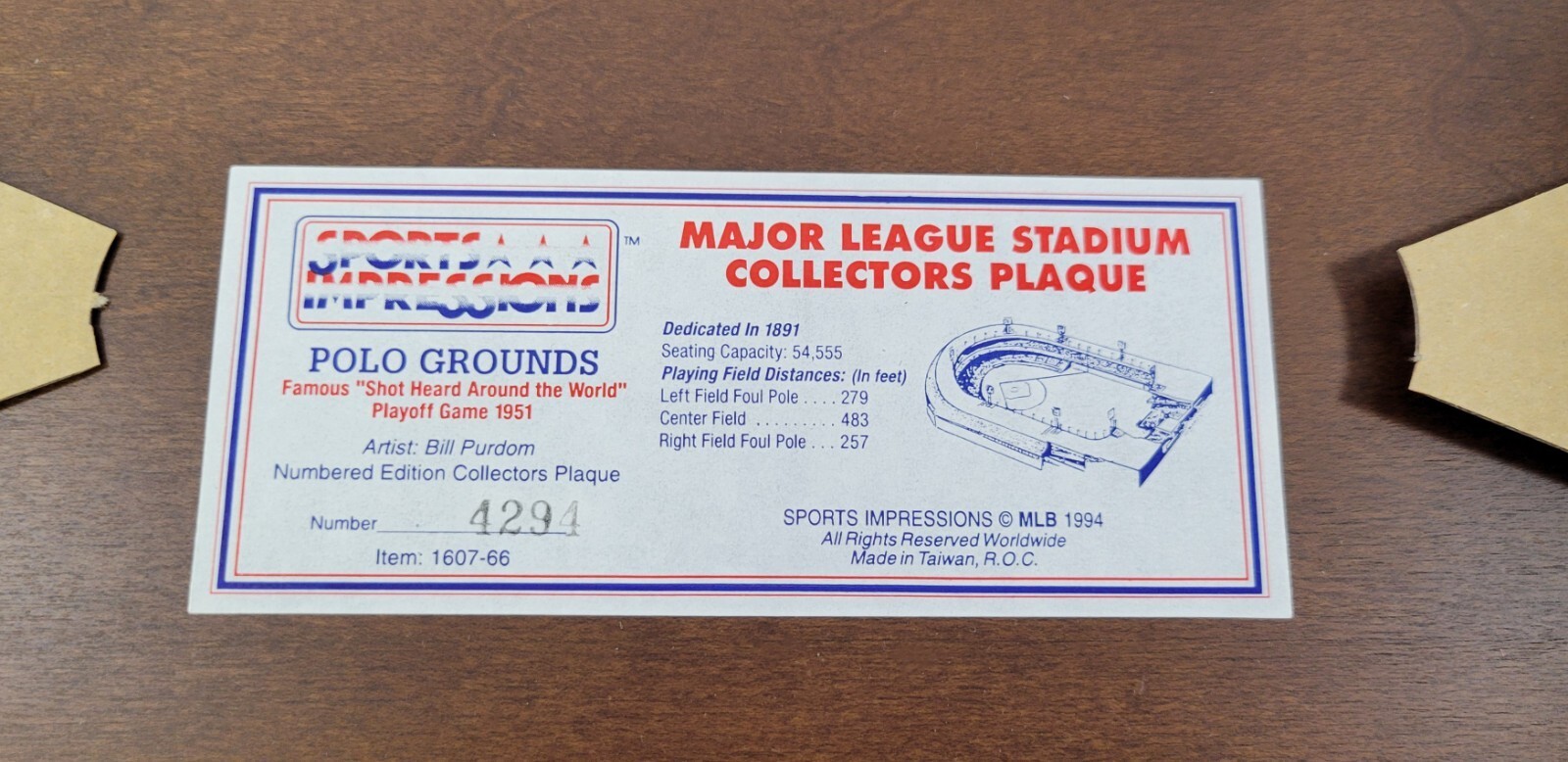 *D) Vintage 1994 Sports Impressions Polo Grounds Major League Stadium Plaque