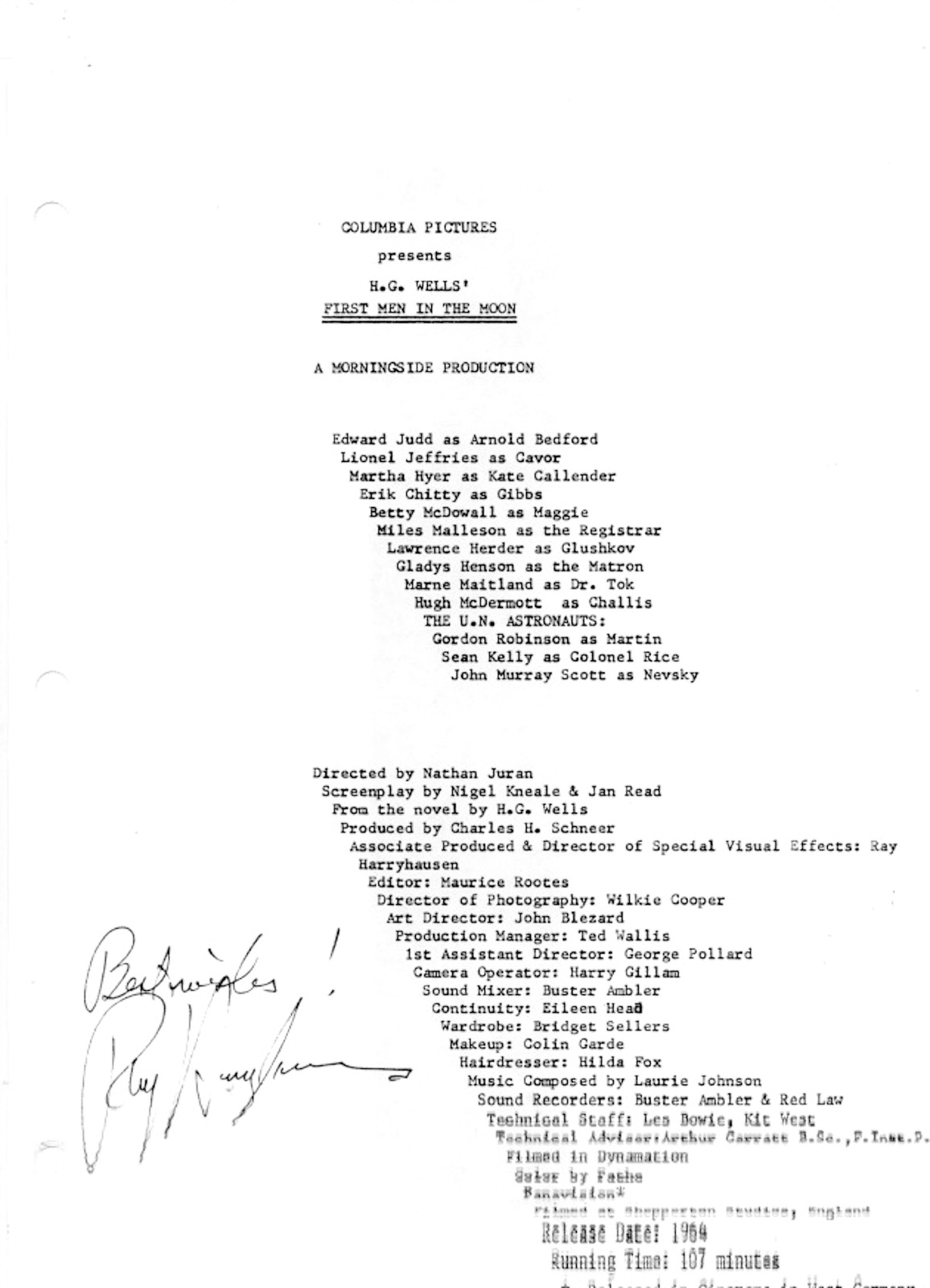 1964’s FIRST MEN IN THE MOON repro film script with Ray Harryhausen autograph