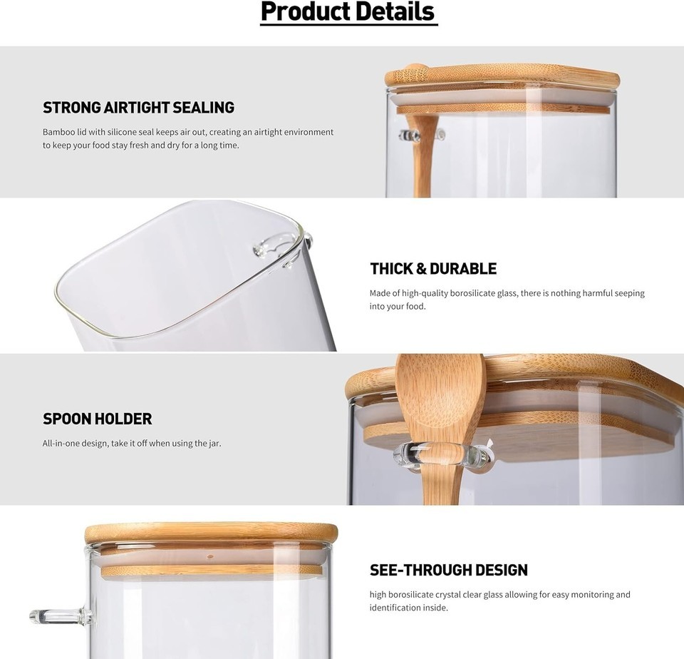 [Unique Design] The glass spice Jar with bamboo Lid and Spoon;They're airtight with silicone seals,so Great for wet or dry foods, baking goods , cookies, cereals, tea leaves;There is a glass loop on the jar to store Spoon,When you use it, you only need to slide the spoon out of the glass ring without going to the silverware drawer.